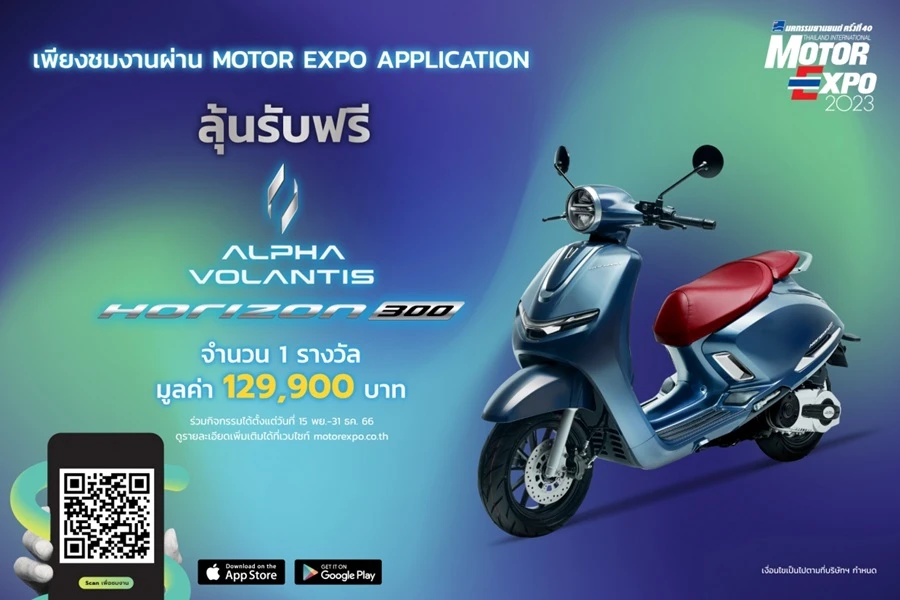 ดาวน์โหลด MOTOR EXPO APP ได้ทั้งระบบ iOS และ Android พร้อมมีกิจกรรม ชมงานผ่าน MOTOR EXPO APP ชิงรางวัล ชิงรถจักรยานยนต์ ALPHA VOLANTIS รุ่น HORIZON300 มูลค่า 129,900 บาท จำนวน 1 รางวัล ตั้งแต่วันที่ 15 พฤศจิกายน 2566 – 31 ธันวาคม 2566