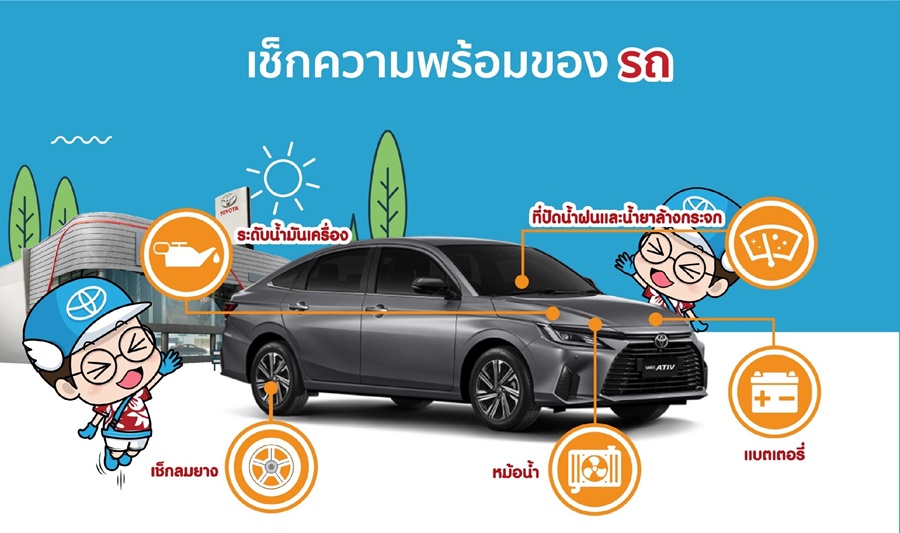 บริษัทฯ พร้อมด้วยผู้แทนจำหน่ายโตโยต้าทั่วประเทศ จึงจัดให้มีบริการตรวจเช็กสภาพรถยนต์ฟรี 24 รายการ ในช่วงเทศกาลท่องเที่ยวสงกรานต์ เพื่อเป็นการเตรียมความพร้อมรถยนต์ให้อยู่ในสภาพสมบูรณ์ และป้องกันการเกิดอุบัติเหตุ ซึ่งผู้ที่สนใจสามารถนำรถยนต์ไปตรวจเช็กได้ตั้งแต่วันที่ 1-30 เมษายน 2566 โดยมีรายการตรวจเช็ก 24 รายการ ดังนี้