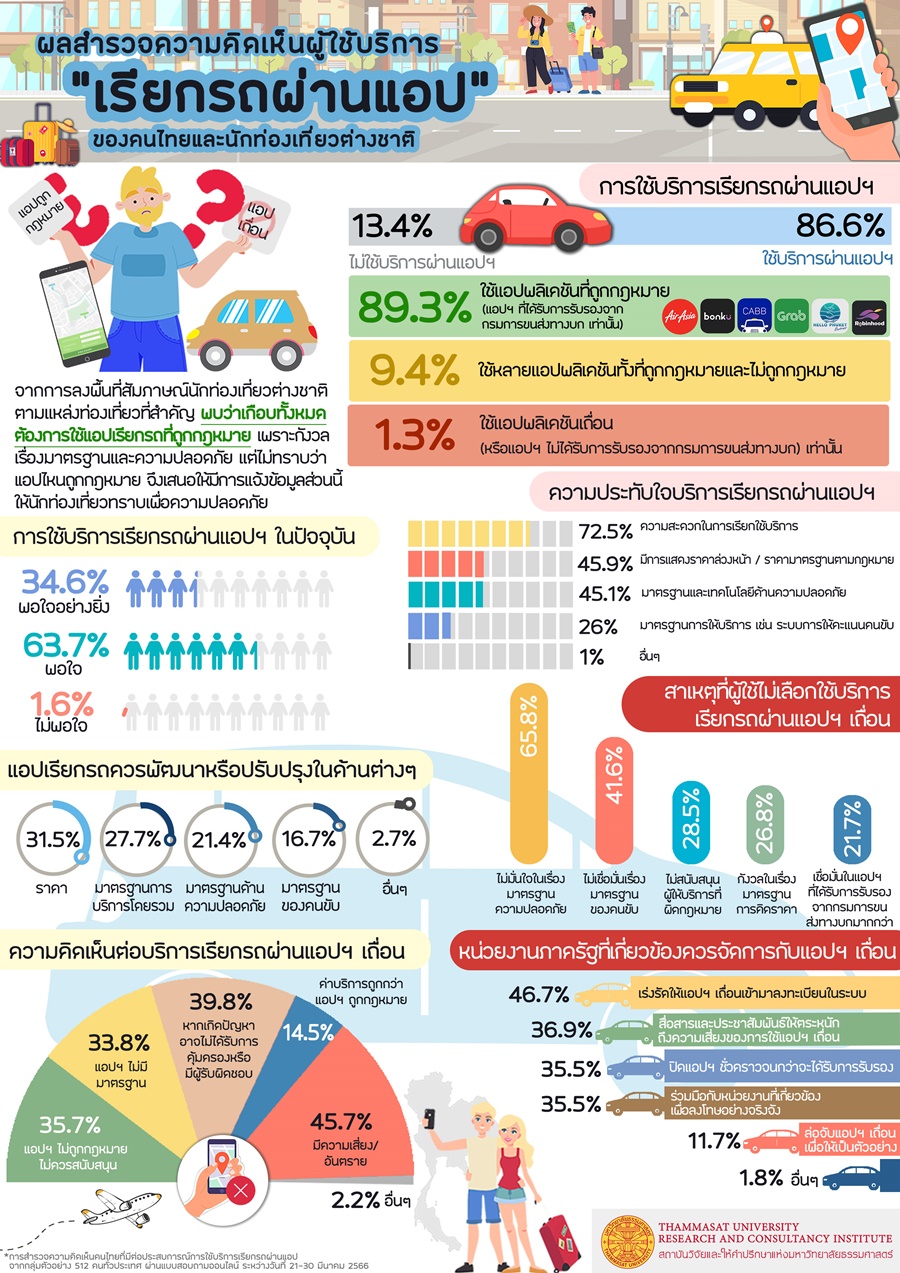 สถาบันวิจัยและให้คำปรึกษาแห่งมหาวิทยาลัยธรรมศาสตร์ (TU-RAC) โดย ผศ. ดร. สุทธิกร กิ่งเเก้ว ผู้บริหารโครงการวิจัย เผยผลสำรวจความคิดเห็นของคนไทย รวมถึงนักท่องเที่ยวต่างชาติ ที่มีต่อประสบการณ์การใช้บริการรถยนต์ส่วนบุคคลเพื่อรับจ้างสาธารณะผ่านแอปพลิเคชัน หรือบริการ เรียกรถผ่านแอป ซึ่งเป็นบริการที่ถูกกฎหมายแล้วในประเทศไทย ผ่านการทำแบบสอบถามออนไลน์จากกลุ่มตัวอย่างทั่วประเทศจำนวน 512 คน1 รวมถึงลงพื้นที่เพื่อสัมภาษณ์นักท่องเที่ยวชาวต่างชาติในแหล่งท่องเที่ยวสำคัญ พร้อมนำเสนอแนวทางในการพัฒนาปรับปรุงการให้บริการเพื่อยกระดับคุณภาพขนส่งสาธารณะ รวมถึงการกำกับดูแลมาตรฐานของบริการดังกล่าวโดยหน่วยงานภาครัฐ ตลอดจนการกำหนดมาตรการในการจัดการ แอปเถื่อน หรือแอปพลิเคชันที่ไม่ได้รับการรับรองจากกรมการขนส่งทางบก เพื่อป้องกันความเสี่ยงหรืออันตรายที่อาจเกิดขึ้น และสร้างความมั่นใจให้กับผู้ใช้บริการทั้งชาวไทยและชาวต่างชาติ โดยผลการสำรวจพบว่า