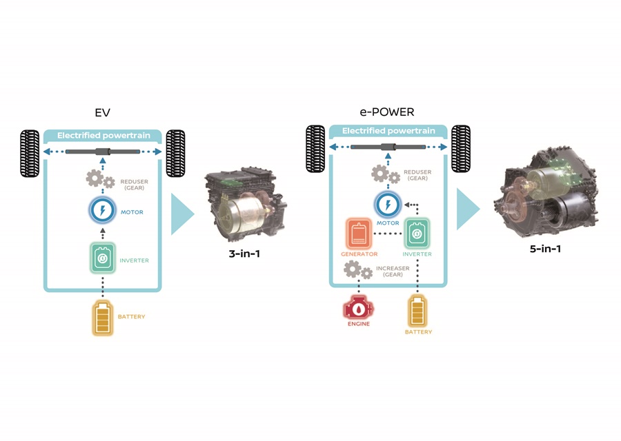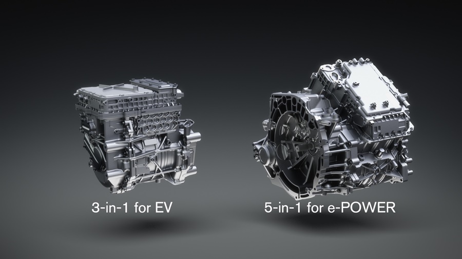 แนวทาง X-in-1 ซึ่งมีครอบคลุมทั้ง 3 ชิ้นส่วนหลัก หรือ 3-in-1 และแบบ 5 ชิ้นส่วนหลัก หรือ 5-in-1 และรุ่นอื่นๆ ที่เป็นไปได้ จะได้รับการพัฒนาเพื่อให้ส่วนประกอบหลักของระบบขับเคลื่อนทั้งแบบ EV และ แบบe-POWER สามารถดำเนินการผลิตต่อไปได้ในสายการผลิตเดียวกัน