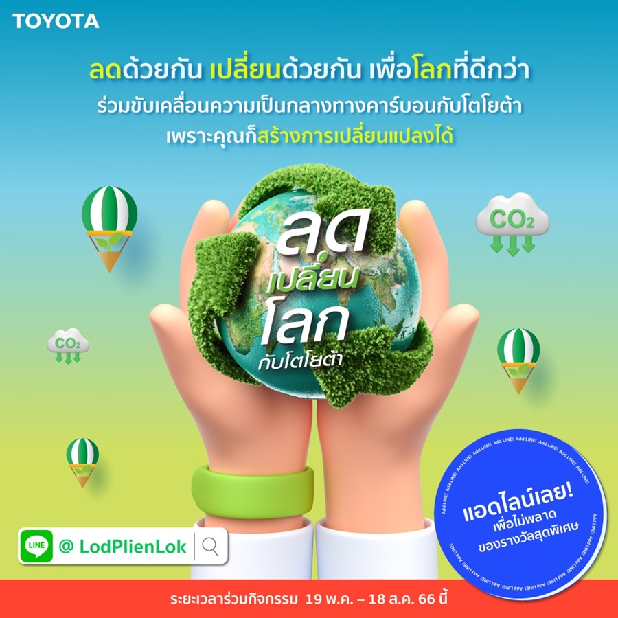 บริษัท โตโยต้า มอเตอร์ ประเทศไทย จำกัด จัดกิจกรรม ลดเปลี่ยนโลกกับโตโยต้า เชิญชวนคนไทยร่วมลดการปล่อยก๊าซคาร์บอนไดออกไซด์ในชีวิตประจำวัน ผ่านทาง Line @ LodPlienLok เชิญชวนคนไทยร่วมปลูกต้นไม้ 1 ต้น ต่อทุกการลด CO2 1 ครั้ง เพื่อกระตุ้นให้เกิดการปรับเปลี่ยนพฤติกรรม และเป็นส่วนหนึ่งในการขับเคลื่อนประเทศไทยเข้าสู่เป้าหมายความเป็นกลางทางคาร์บอน ระยะเวลาร่วมกิจกรรม ตั้งแต่วันที่ 19 พฤษภาคม ถึง 18 สิงหาคม ศกนี้