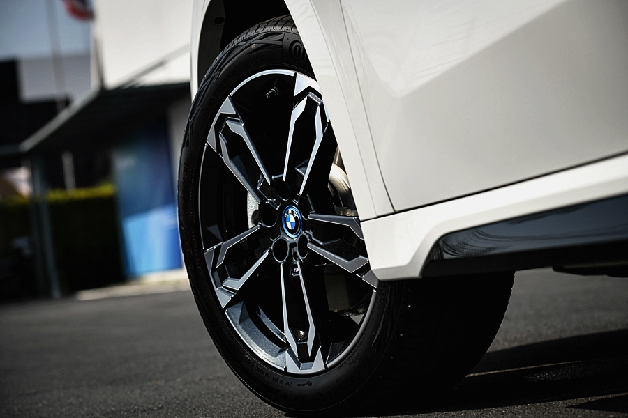 ส่วนหน้าของบีเอ็มดับเบิลยู X1 xDrive30e M Sport ให้ความรู้สึกที่ชัดเจนยิ่งขึ้น โดดเด่นด้วยไฟหน้า LED แบบเพรียว กระจังหน้าทรงไตคู่ขนาดใหญ่ที่เกือบเป็นสี่เหลี่ยม เส้นสายรูปตัว X ที่แผ่ออกไปด้านข้าง และแถบโครเมียมอันสะดุดตาที่ช่องรับอากาศด้านล่าง รถรุ่นนี้ยังติดตั้งระบบไฟหน้า Adaptive LED มาเป็นมาตรฐานพร้อมกับระบบปรับการทำงานไฟสูงอัตโนมัติ (High-beam assistant) และล้ออัลลอย M ขนาด 19 นิ้ว ลาย Double-spoke แบบสลับสี