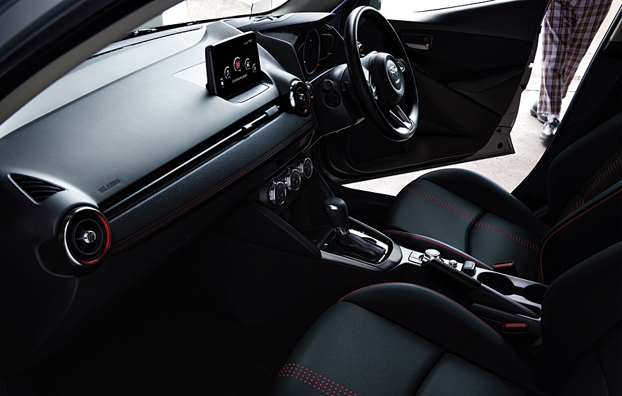 ● New Mazda2 มาพร้อมกับ 2 ดีไซน์ใหม่ ประกอบด้วย Sport Design ที่ส่งผ่านความสปอร์ตโฉบเฉี่ยวได้อย่างชัดเจน ด้วยกันชนหน้า พร้อมกระจังหน้าแบบ Mesh Grille ดีไซน์ใหม่ ยกระดับความสปอร์ตด้วยกระจกมองข้างและหลังคาสีดำ ที่เข้ากับความสปอร์ตของกระจังหน้าได้อย่างลงตัว และมาพร้อมกับล้อ ขนาด 16 นิ้ว ดีไซน์ใหม่ ที่ยกระดับความสปอร์ตหรูขึ้นไปอีกขั้น ในขณะที่ภายในมอบความสปอร์ตพรีเมี่ยมด้วยเบาะหนังสีดำสลับกับผ้า Grand Luxe Suede® แบบสปอร์ตดีไซน์ใหม่ ให้ความประณีตด้วยวัสดุคุณภาพสูง พร้อมเพิ่มความสปอร์ตให้กับดีไซน์ภายในด้วยการตกแต่งสีแดงที่กรอบช่องแอร์ และเบาะนั่งเดินตะเข็บสีแดง เพื่อตอบโจทย์คนรุ่นใหม่ที่มองหารถสปอร์ตที่ทั้งขับสนุกและมีเอกลักษณ์ในตัวเองอย่างชัดเจน