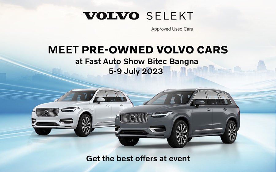 วอลโว่ คาร์ ประเทศไทย ร่วมงาน Fast Auto Show Thailand & EV Expo 2023 พร้อมนำรถผู้บริหารไมล์น้อยคุณภาพดีซึ่งผ่านการคัดสรรและตรวจสอบตามมาตรฐานของวอลโว่ภายใต้แบรนด์ Volvo Selekt มาร่วมจัดแสดงที่บูธ B05 โถงนิทรรศการ 104 ณ ศูนย์นิทรรศการและการประชุม ไบเทค บางนา ระหว่างวันที่ 5 – 9 กรกฎาคม พ.ศ. 2566