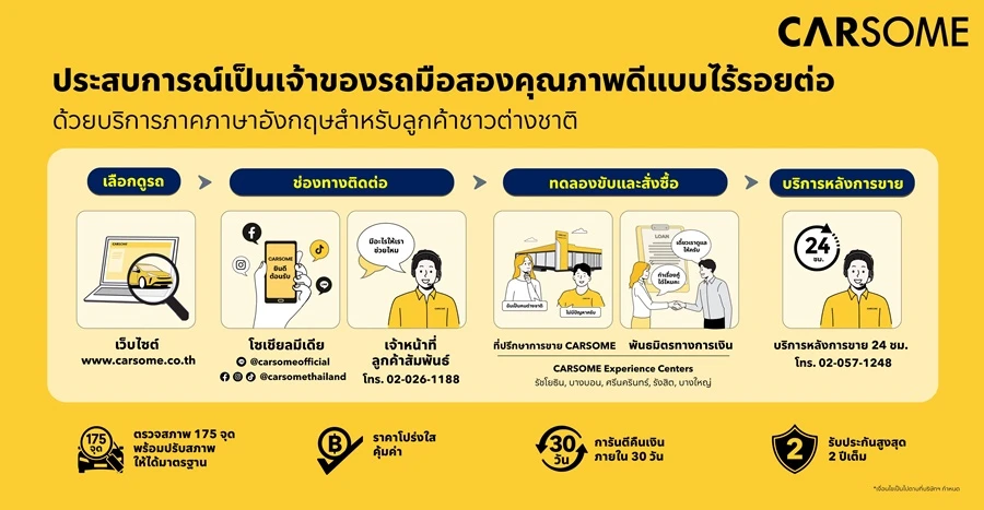 นอกเหนือจากการช่วยเหลือภาคภาษาอังกฤษแล้ว CARSOME ยังมุ่งมั่นส่งมอบบริการที่ตอบสนองกับความต้องการที่หลากหลายของลูกค้า ไม่ว่าจะเป็น การตรวจสภาพอย่างเข้มงวด 175 จุดพร้อมปรับสภาพให้ได้มาตรฐาน การการันตีคืนเงินภายใน 30 วัน ราคาโปร่งใสคุ้มค่า และโปรแกรม CARSOME Cares ที่คุ้มครองสูงสุดถึง 2 ปีและให้บริการหลังการขายตลอด 24 ชั่วโมง