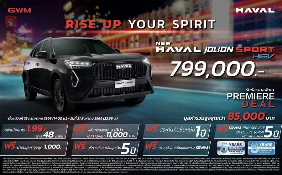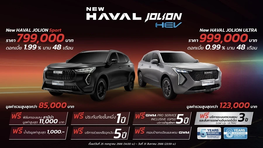 New HAVAL JOLION Hybrid SUV รุ่น Sport รวมมูลค่า 85,000 บาท และรุ่น ULTRA รวมมูลค่า 123,000 บาท (*เงื่อนไขข้อเสนอและการให้บริการเป็นไปตามที่บริษัทฯ กําหนด ดูรายละเอียดได้ที่