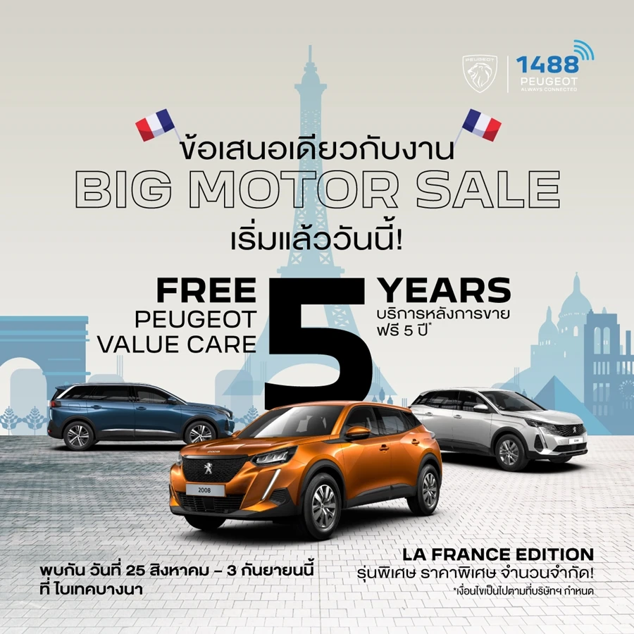 พร้อมบริการหลังการขาย 23 แห่งทั่วประเทศ รองรับกลุ่มลูกค้าที่เน้นความพรีเมียมสไตล์ฝรั่งเศส คุณภาพการผลิต และมาตรฐานความปลอดภัยแบบยุโรป พร้อมจัดทัพ เปอโยต์ 2008, 3008 และ 5008 เอสยูวี 7 ที่นั่ง รุ่นพิเศษ LE FRANCE EDITION ราคาดีที่สุดแห่งปี ในงานมหกรรมเปิดโลกยานยนต์ BIG MOTOR SALE 2023 ระหว่างวันที่ 25 สิงหาคม ถึง 3 กันยายน 2566 ณ ศูนย์นิทรรศการและการประชุมไบเทค บางนา