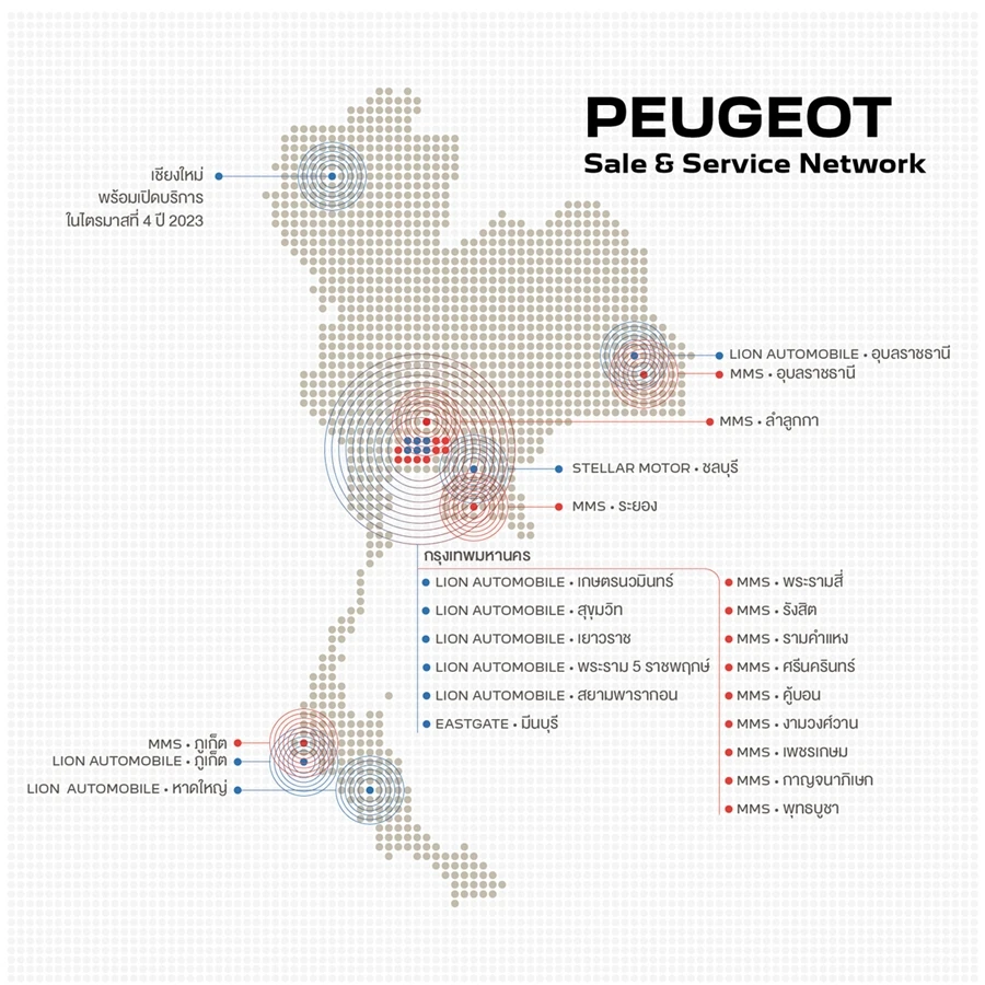 ปีนี้ เปอโยต์ ได้ขยายเครือข่ายอย่างครอบคลุม 10 แห่งทั้งประเทศ และในช่วงปลายปีเตรียมปักหมุดเพิ่มที่จังหวัดเชียงใหม่ แลนมาร์คสำคัญ ล่าสุดกับการขยายเครือข่ายการบริการหลังการขาย โดยผู้แทนจำหน่ายอย่าง เปอโยต์ ไลอ้อน ออโตโมบิล ได้ผนึกกำลังกับ เอ็มเอ็มเอส บ๊อช คาร์ เซอร์วิส แอนด์ ไทร์ (MMS) ซึ่งเชี่ยวชาญและมีประสบการณ์ด้านการซ่อมบำรุงรถยนต์แบบครบวงจร ภายใต้ชื่อ ‘Peugeot service outlet’ อีก 13 สาขา จะทำให้แบรนด์ เปอโยต์ มีเครือข่ายบริการหลังการขาย รวมทั้งสิ้น 23 แห่งทั่วประเทศ โดยจะเริ่มดำเนินการได้ตั้งแต่วันที่ 1 กันยายนนี้ เป็นต้นไป