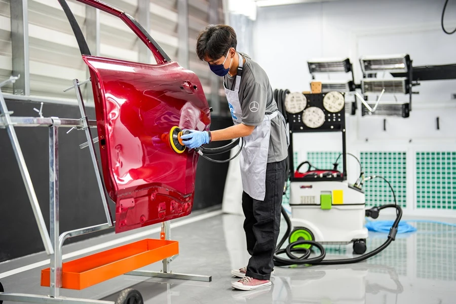 ภายในห้องพ่นอบสีที่มีอุณหภูมิคงที่ พร้อมเลือกผลิตภัณฑ์สีน้ำ คุณภาพมาตรฐานระดับนานาชาติ และเป็นมิตรกับสิ่งแวดล้อม รองรับงานซ่อมสี และตัวถัง เดือนละ 150 คัน ให้บริการทั้งการซ่อมงานหนักและงานเบา พร้อมรับงานซ่อมจากบริษัทประกันทุกแห่ง ด้วยทีมงานระดับมืออาชีพที่มีความรู้และความชำนาญด้านงานสีและตัวถังกว่า 20 ปี ทั้งผ่านมาตรการการฝึกอบรมจาก Mercedes-Benz ในระดับสูง ทำให้มั่นใจว่า ทุกงานซ่อมสีและตัวถังจะได้มาตรฐานและคุณภาพที่สร้างความพึงพอใจให้แก่ลูกค้าทุกท่านอย่างแน่นอน