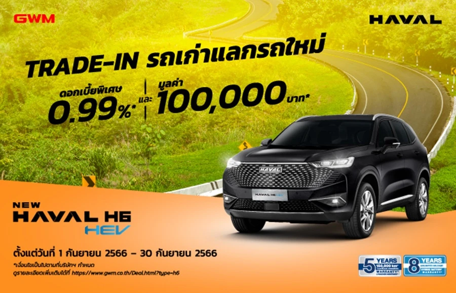 เป็นเจ้าของยานยนต์คุณภาพได้สะดวกมากยิ่งขึ้น เพียงลูกค้านำรถยนต์เก่ามาซื้อ รับส่วนลดทันที 100,000 บาท นอกจากนี้ ยังมีดอกเบี้ยพิเศษ 0.99% เมื่อดาวน์ 25% และ ผ่อน 48 เดือน* มูลค่าสูงสุดไม่เกิน 80,000 บาทอีกด้วย โดย New HAVAL H6 Hybrid SUV เป็นรถยนต์คอมแพคเอสยูวีที่สามารถครองใจผู้ขับขี่ชาวไทยได้อย่างต่อเนื่องตั้งแต่เปิดตัวครั้งแรก อัดแน่นไปด้วยเทคโนโลยีการขับขี่และความปลอดภัยที่ล้ำสมัยรอบด้าน สมรรถนะของรถยนต์ที่โดดเด่น แพลตฟอร์ม GWM LEMON แพลตฟอร์มโมดูล่าร์อัจฉริยะที่รองรับการขับขี่ที่หลากหลาย ตลอดจนราคาที่จับต้องได้ ทำให้รถยนต์รุ่นนี้สามารถกวาดยอดขายได้เป็นอันดับ 1 ในกลุ่มรถยนต์คอมแพคเอสยูวีได้อย่างเหนียวแน่นติดต่อกันถึง 12 เดือนในปี 2565