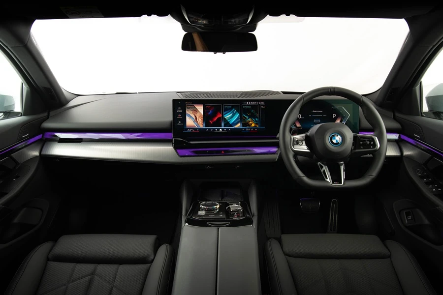 สำหรับที่นั่งคนขับด้านหน้า ยังคงมุ่งเน้นไปที่ความสบายและมั่นใจของผู้ขับขี่ ด้วยระบบหน้าจอโค้ง BMW Curved Display ที่แบ่งออกเป็นจอ Information Display ขนาด 12.3 นิ้ว และจอแสดงระบบควบคุม Control Display ขนาด 14.9 นิ้ว บนระบบปฏิบัติการ BMW Operating System 8.5 ที่มาพร้อมฟีเจอร์ QuickSelect ทำให้ผู้ขับขี่บีเอ็มดับเบิลยู i5 สามารถใช้งานฟังก์ชันต่าง ๆ ผ่านไอคอนที่จัดเรียงมาในรูปแบบแถวแนวตั้งด้านข้างคนขับ ช่วยลดระยะเวลาในการใช้งานเมนูย่อยก่อนการเปิดใช้ฟีเจอร์นั้น ๆ นอกจากนี้ หน้าจอแสดงผลแบบโค้ง BMW Curved Display ยังทำงานควบคู่ไปกับระบบ BMW iDrive เพื่อส่งมอบการควบคุมที่ง่ายดายผ่านระบบหน้าจอสัมผัส ปุ่มคำสั่งบนพวงมาลัย และอุปกรณ์ควบคุม BMW iDrive Controller ที่บริเวณกลางคอนโซล นอกจากนี้ แพ็คเกจ BMW Live Cockpit Professional ยังมาพร้อมกับหน้าจอแสดงผล BMW Head-Up Display และมุมมองแบบ Augmented View ซึ่งผู้ขับขี่สามารถใช้งานเป็นหน้าจอสำหรับควบคุมการใช้งานด้านต่าง ๆ หรือจะใช้เป็นเป็นหน้าจอเสริมแบบ instrument cluster ก็ได้