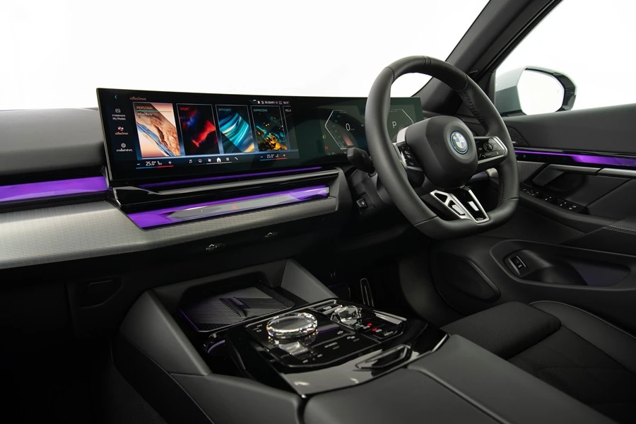 ความสปอร์ตในสไตล์ M ยังเห็นได้เด่นชัดในห้องโดยสารของบีเอ็มดับเบิลยู i5 ใหม่ ด้วยพวงมาลัยหนังสไตล์ M ตกแต่งด้วย CraftedClarity ที่ทำจากแก้วคริสตัล และเบาะนั่งด้านหน้าแบบ Comfort พร้อมระบบปรับด้วยไฟฟ้า ขณะที่ระบบไฟส่องสว่างทั้งภายในและภายนอกห้องโดยสาร ม่านบังแดดสำหรับผู้โดยสารที่เบาะหลัง และชุดอุปกรณ์ Travel & Comfort ก็เสริมความหรูหราและสะดวกสบายให้ทุกการเดินทาง โดยห้องโดยสารด้านในของบีเอ็มดับเบิลยู i5 eDrive40 M Sport จะมาพร้อมกับสี Dark Silver M ประดับด้วยขอบ Aluminium Rhombicle ในขณะที่บีเอ็มดับเบิลยู i5 M60 xDrive จะมาพร้อมสี Dark Silver M accent ที่ผสมผสานเข้ากับวัสดุ Carbon Fibre และขอบสีเงิน high-gloss silver นอกจากนี้ ทั้งคนขับ ผู้โดยสารด้านหน้า และผู้โดยสารที่เบาะหลังทั้ง 2 ด้าน ยังจะได้รับความสะดวกสบายอย่างเต็มรูปแบบ ด้วยระบบการปรับอุณหภูมิ ความแรงลม และการระบายอากาศแบบแยกโซน รวมไปถึงระบบการตั้งโปรแกรมเครื่องปรับอากาศแบบอัตโนมัติ 5 ระดับ เซ็นเซอร์แสงอาทิตย์ที่ด้านหลัง และระบบกรองฝุ่นละอองระดับนาโนพาร์ทิเคิล (nano particulate filters) พร้อมจะส่งมอบทั้งประสบการณ์การใช้งานอันแสนจะง่ายไปพร้อมกับสภาพอากาศที่บริสุทธิ์ตลอดระยะเวลาการเดินทาง