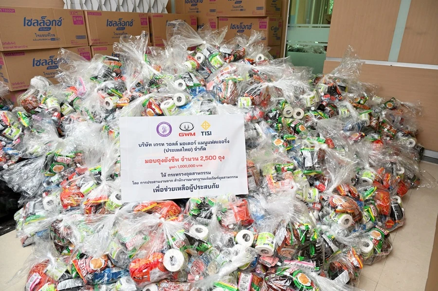 GWM: Go With Me Go Together รวมหัวใจพร้อมก้าวผ่านทุกวิกฤตไปด้วยกัน ผนึกกำลังกระทรวงอุตสาหกรรมและสำนักงานมาตรฐานผลิตภัณฑ์อุตสาหกรรม มอบถุงยังชีพรวมทั้งสิ้น 2,500 ถุงให้กับผู้ประสบภัยน้ำท่วมเฉียบพลันในประเทศไทย รวมมูลค่าความช่วยเหลือกว่า 1,000,000 บาท พร้อมนำรถยนต์