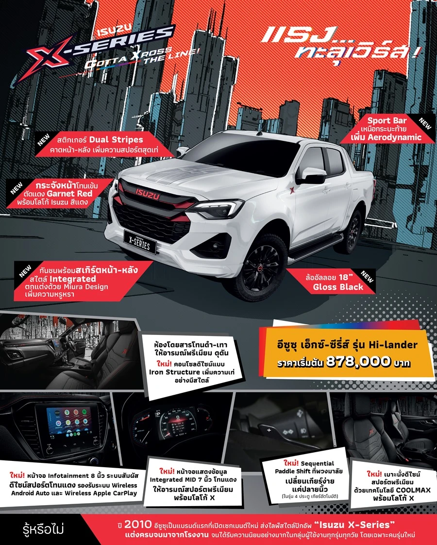 อีซูซุ เอ็กซ์-ซีรี่ส์ แรง…ทะลุเวิร์ส” (Isuzu X-Series…Gotta Xross The Line!) ปิกอัพสปอร์ตดีไซน์ใหม่ ทุก Element โดดเด่นไม่ซ้ำใคร ด้วยใหม่! ชุดแต่ง The X Package เหนือกว่าด้วยสมรรถนะการขับขี่ที่สนุกเร้าใจ พร้อมดีไซน์ Aerodynamic ให้ออกไปโลดแล่นนอกกรอบกับทุกมิติที่เป็นคุณ แบ่งออกเป็น 2 รุ่น ได้แก่