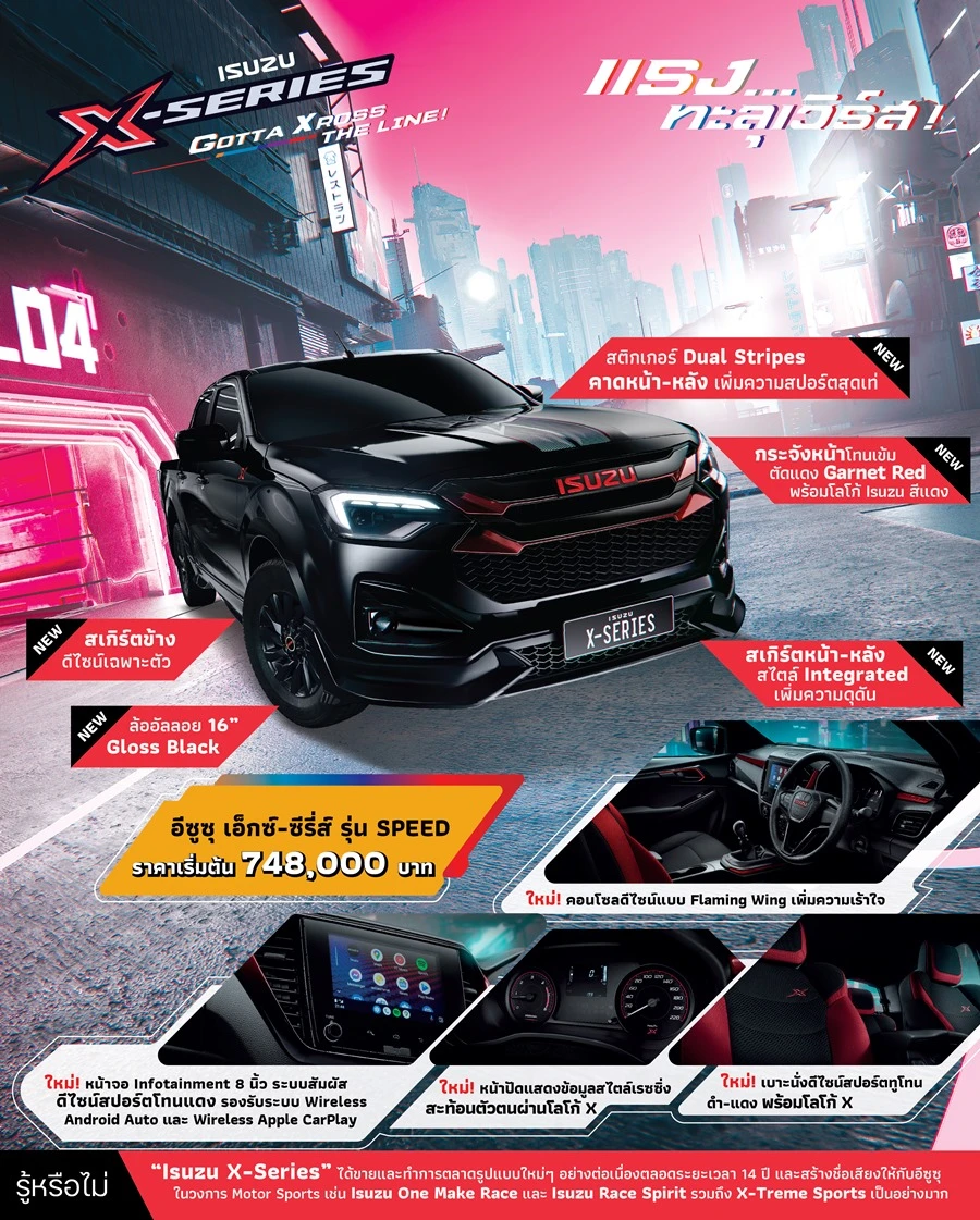 Speed (Isuzu X-Series Speed) จัดไป...ใส่เต็มสปีด! ปิกอัพสปอร์ตแนวสตรีทเรซ กับไอเทมรอบคัน ให้คุณมันส์เร้าใจทะลุเวิร์สไปกับทุกสปีดที่ใจต้องการ โดดเด่นด้วยกระจังหน้าโทนเข้มตัดแดง Garnet Red สติกเกอร์ Dual Stripes คาดหน้า-หลัง พร้อมสเกิร์ตหน้า-หลังสไตล์ Integrated สเกิร์ตข้างดีไซน์เฉพาะตัว ล้ออัลลอย 16” Gloss Black ห้องโดยสารโทนดำ-แดง ให้อารมณ์สปอร์ตเร้าใจ ราคาจำหน่ายตั้งแต่ 748,000 – 851,000 บาท