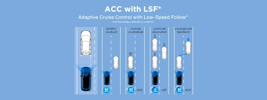 - ระบบควบคุมความเร็วอัตโนมัติแบบแปรผัน (Adaptive Cruise Control: ACC) (รุ่น S+, SV และ RS) พร้อม ใหม่! ระบบปรับความเร็วตามรถยนต์คันหน้าที่ความเร็วต่ำ (with Low-Speed Follow: with LSF) (เฉพาะรุ่น e:HEV SV และ e:HEV RS)