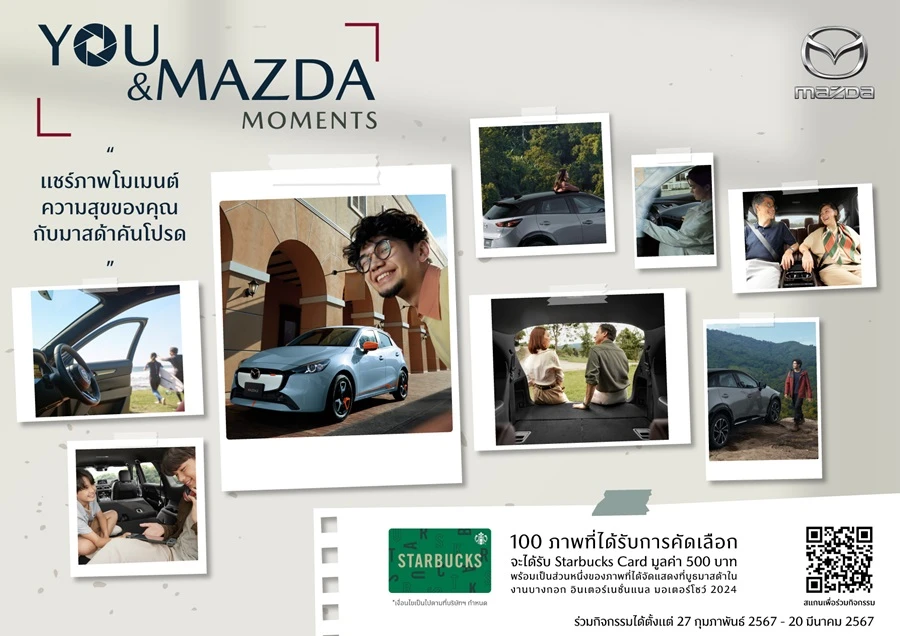 นิยามความสุขของแต่ละคนนั้นไม่เหมือนกัน บางคนมีความสุขกับการให้ บางคนสุขกับการรับ บางทีความสุขอาจหาได้จากสิ่งที่อยู่รอบๆ ตัวเรา แม้จะเป็นความสุขเล็กๆ ในบางโมเมนต์ ไม่ว่าจะสุขอย่างไร วันนี้ มาสด้าชวนลูกค้ามาช่วยกันแชร์ภาพความสุขและความประทับใจกับรถมาสด้าคันโปรด ให้คนที่รักในการเดินทางได้อิจฉาในความสุขของการเดินทางไปกับรถมาสด้า กับกิจกรรม You and Mazda Moments ร่วมถ่ายทอดเรื่องราวและประสบการณ์อันน่าจดจำโดยมีรถยนต์มาสด้าเป็นพาหนะคู่ใจในทุกการเดินทาง เรื่องราวและภาพความประทับใจที่ลูกค้าส่งเข้าร่วมกิจกรรมจะถูกนำขึ้นแสดงบนแกลเลอรี่วอลล์ที่บูธมาสด้าในงานมอเตอร์โชว์ 2024