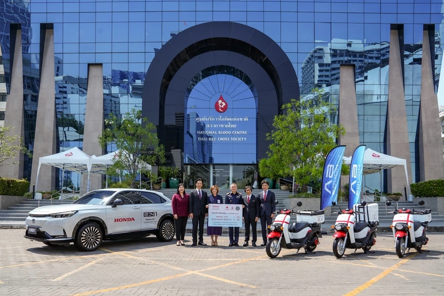 นายฮิเดโอะ คาวาซากะ (ที่ 2 จากซ้าย) ประธานกรรมการบริหารและซีอีโอ บริษัท ฮอนด้า ออโตโมบิล (ประเทศไทย) จำกัด และ นางสาวมนวรา เพชรพลากร (ซ้าย) ผู้จัดการทั่วไปส่วนการตลาด บริษัท ฮอนด้า ออโตโมบิล (ประเทศไทย) จำกัด พร้อมด้วย นายชิเกโตะ คิมูระ (ขวา) ประธานกรรมการบริหาร บริษัท ไทยฮอนด้า จำกัด และ ดร.อารักษ์ พรประภา (ที่ 2 จากขวา) ประธาน บริษัท ไทยฮอนด้า จำกัด ร่วมสนับสนุนยานยนต์ไฟฟ้า 100% ทั้ง Honda e:N1 และรถจักรยานยนต์ไฟฟ้า Honda BENLY e: จำนวน 3 คัน ให้แก่ สภากาชาดไทย โดยมี นางสาวปิยนันท์ คุ้มครอง ผู้ช่วยผู้อำนวยการด้านจัดหาโลหิตและภาพลักษณ์องค์กร ศูนย์บริการโลหิตแห่งชาติ สภากาชาดไทย (ที่ 3 จากซ้าย) พร้อมด้วย นาวาอากาศเอก ธำรงค์ประวัติ เชิดเกียรติกุล (ที่ 3 จากขวา) รองผู้อำนวยการ โรงพยาบาลภูมิพลอดุลยเดช กรมแพทย์ทหารอากาศ เป็นผู้แทนรับมอบ ณ ศูนย์บริการโลหิตแห่งชาติ สภากาชาดไทย