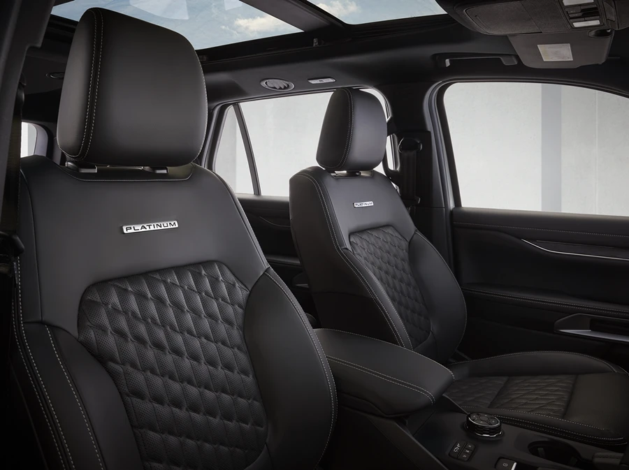 เบาะหนังสีดำตกแต่งโลโก้ซิกเนเจอร์ PLATINUM เป็นเอกลักษณ์ เบาะนั่งคนขับและเบาะนั่งผู้โดยสารตอนหน้าปรับไฟฟ้า 10 ทิศทาง พร้อมระบบปรับอากาศและระบบบันทึกตำแหน่งเบาะที่นั่ง เบาะนั่ง 2 แถวหน้ามีชุดทำความร้อนและระบายอากาศที่ควบคุมได้ผ่านหน้าจอ SYNC และยังมีฟังก์ชันการปรับตำแหน่งเบาะที่นั่งให้เข้าออกสะดวกสำหรับเบาะนั่งคนขับ (Easy Entry and Exit)