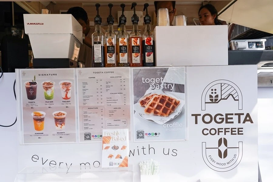 สำหรับ Togeta Pop-up café นำเสนอในรูปแบบของ Mobile Food Truck ที่พัฒนาขึ้นจากรถยนต์ โตโยต้า ไฮลักซ์ แชมป์ รถยนต์เพื่อการพาณิชย์ท้ายเรียบที่มีจุดเด่นในด้านการรองรับการดัดแปลงท้ายกระบะเพื่อการใช้งานที่หลากหลาย โดยนอกจากหลากหลายเมนู ซิกเนเจอร์ ของกาแฟทูเกต้า แล้ว ยังมีเมนูพิเศษจากกลุ่มบาริสต้าของทูเกต้า ภายใต้แนวคิด ของขวัญจากขุนเขา รังสรรค์เป็นเมนูซิกเนเจอร์จัดจำหน่ายเฉพาะที่ Togeta Pop-up café อาทิ
