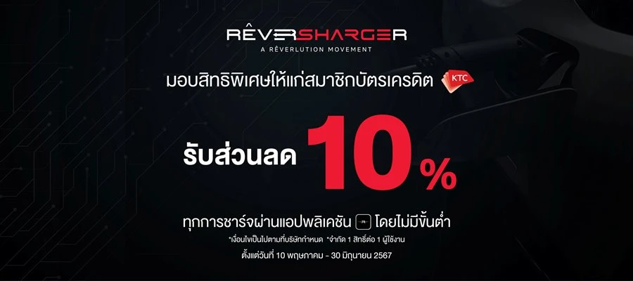 ที่ผ่านมา RÊVERSHARGER มุ่งมั่นยกระดับการบริการด้านการชาร์จรถยนต์ไฟฟ้าแบบครบวงจรอย่างต่อเนื่อง ด้วยจุดแข็งในหลากหลายมิติ ได้แก่ 1.การชาร์จภายในที่อยู่อาศัย เลือกให้บริการติดตั้งแบรนด์ EV Charger คุณภาพสูงจากผู้ผลิตรายใหญ่ระดับโลก เช่น ABB, Autel พร้อมทีมผู้เชี่ยวชาญที่พร้อมให้บริการติดตั้งทั่วประเทศ ให้ความปลอดภัยทุกการชาร์จ 2.การชาร์จระหว่างทาง มีเครือข่ายสถานีชาร์จขนาดใหญ่เตรียมให้บริการครบ 2,012 หัวชาร์จภายในปีนี้ ครอบคลุมการเดินทางไปยังทุกภูมิภาค ทุกระยะ 160 กม. มีสถานีชาร์จความเร็วสูงสุดถึง 360kW ที่ชาร์จเพียง 10 นาที วิ่งได้ไกลสุด 100 กม. 3.แอปพลิเคชัน REVERSHARGER ที่มีฟีเจอร์ Plug & Charge แค่จอดเสียบชาร์จได้ทันที พร้อมสิทธิพิเศษจากพันธมิตร มาช่วยอำนวยความสะดวกให้แก่ผู้ใช้งาน ประกอบกับภาพรวมยอดขายรถ EV ในงาน Motor Show ครั้งล่าสุดยังแข็งแกร่ง และคาดการณ์ว่าจะมียอดจดทะเบียนรถยนต์ไฟฟ้าแบตเตอรี่ (BEV) สะสมทะลุ 200,000 คันในสิ้นปีนี้ บริษัทจึงเชื่อมั่นว่า แคมเปญร่วมกับ เคทีซี จะช่วยรองรับความต้องการของผู้ใช้งานรถ EV ที่มองหา EV Charger สำหรับติดตั้งในบ้าน และสถานีบริการนอกบ้านได้