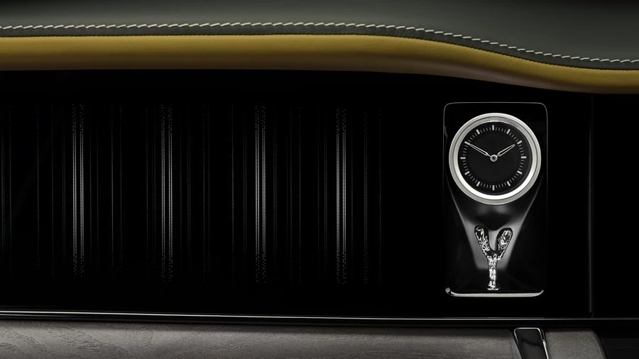 บริเวณฐานนาฬิกาในห้องโดยสาร ติดตั้งนางฟ้า ‘สปิริตออฟเอ็กสตาซี’ (Spirit of Ecstasy) เพิ่มการตกแต่งด้วยวัสดุจากธรรมชาติ ผสานความประณีตแห่งงานฝีมือร่วมสมัย