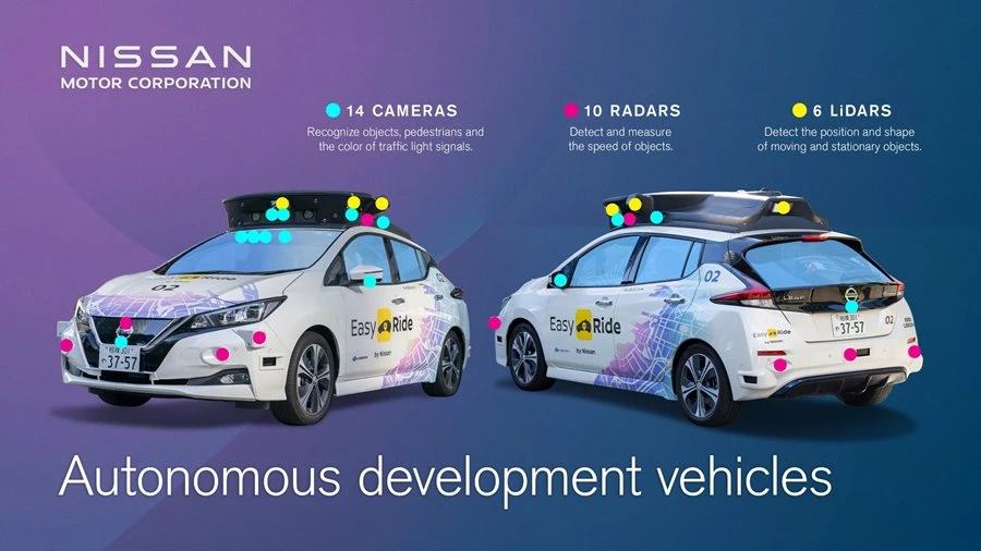 รถยนต์ต้นแบบ นิสสัน ลีฟ ประกอบด้วยกล้อง 14 ตัว Radar 10 ตัว และเทคโนโลยี LIDAR 6 ตัว นำเสนอถึงความก้าวหน้าของนิสสันในด้านการพัฒนาระบบขับขี่อัตโนมัติ โดยเฉพาะอย่างยิ่ง ในสภาพแวดล้อมของเมืองที่มีความซับซ้อน และเมื่อเปรียบเทียบกับรถต้นแบบรุ่นก่อนๆ ที่บริษัทได้สาธิตไปก่อนหน้านี้ รถยนต์ทดสอบรุ่นล่าสุดมีเซ็นเซอร์ที่ถูกติดตั้งบนหลังคาหลายชุด ซึ่งขยายพื้นที่ในการช่วยตรวจจับได้อย่างมากขึ้น และทำให้สามารถตรวจจับสภาพแวดล้อมได้แม่นยำมากยิ่งขึ้น