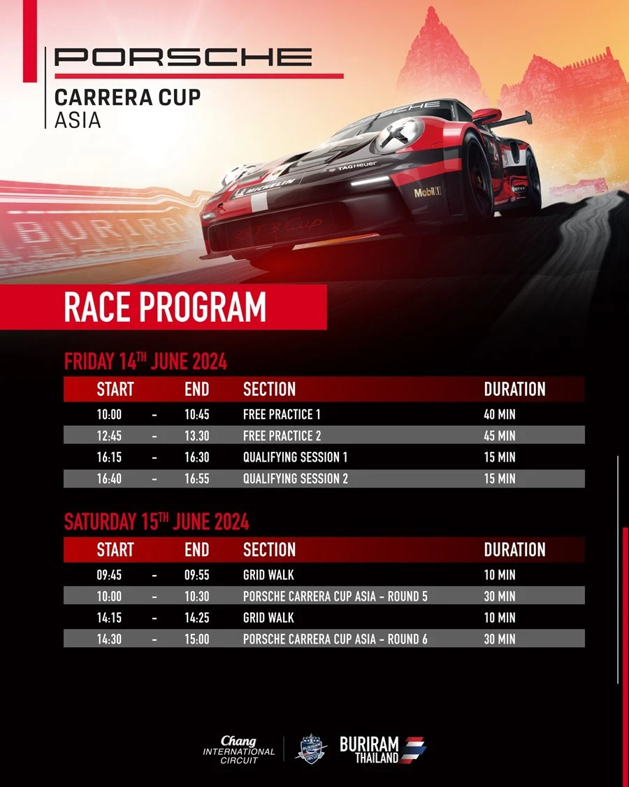นายตนัยศิริ ชาญวิทยารมณ์ กรรมการผู้อำนวยการ สนามช้าง อินเตอร์เนชั่นแนล เซอร์กิต กล่าวว่า “การมาถึงของกองทัพรถแข่งในแต่ละรายการ กลายเป็นภาพที่แฟนความเร็วรอคอย โดยเฉพาะ ปอร์เช่ คาร์เรร่า คัพ เอเชีย ถือเป็นหนึ่งในเรซที่ได้รับความนิยมอย่างสูง แข่งขันด้วยรถแข่ง ปอร์เช่ 911 จีที3 คัพ (Type 992) ยนตรกรรมสายพันธุ์สปอร์ต เวอร์ชั่นล่าสุด รถในฝันที่ถูกใจแฟนความเร็วทั่วโลก ด้วยรูปทรงที่ดุดัน เร้าใจด้วยความสามารถในรูปแบบรถแข่งอย่างเต็มพิกัด นอกจากนี้ ยังมี เทอร์โบ-มั่นคง นักแข่งไทยหนึ่งเดียวในรายการนี้ ที่ลงแข่งขันในคลาส Am ภายใต้สังกัด อีบีเอ็ม จิ๊กะ เรซซิ่ง หมายเลข 76 ขอเชิญแฟนๆ ร่วมส่งแรงใจเชียร์นักแข่งไทยคว้าชัยในโฮมเรซให้ได้ครับ”