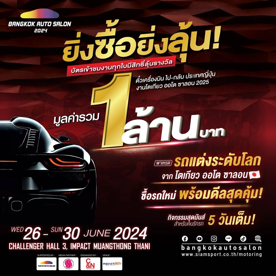สิ้นสุดการรอคอย! พร้อมนับถอยหลังสู่ปรากฏการณ์ทางวัฒนธรรมคนรักรถแต่งที่ยิ่งใหญ่ที่สุดในอาเซียน แบงค็อก ออโต ซาลอน 2024 (Bangkok Auto Salon 2024) ครั้งทื่ 10 ช่วงเวลากลางปีหนึ่งเดียวของเมืองไทย เร่งทุกอัตราความเร็วและแรงไปกับไฮไลท์! แห่งปีที่คนรักรถแต่งและผู้ชื่นชอบการแต่งรถ ล่าสุด 6 สุดยอดรถแต่งระดับโลกที่มาพร้อมนวัตกรรมการแต่งรถจากสำนักแต่งชื่อดังของโลกที่ได้รับรางวัลจากงานโตเกียว ออโต ซาลอน 2024 ได้เดินทางมาถึงเมืองไทยเรียบร้อยแล้ว ล่าสุดระเบิดความมันส์ไปกับกิจกรรม TOKYO UNBOX ก่อนที่จะปรากฏตัวในงาน นำโดย Toyota Prius Kuhl Racing 60R-GTW Wide Body, Mazda Roadster RE Amemiya, Honda NSX Two7 Bagged, Suzuki Jimny Sierra Outclass Overland Style, Nissan GT-R (2024) Top Secret R35 Gold M24 SPL, Nissan Fairlady Z (RZ34) VeilSide FFZ400 เพียงปีละครั้งและงานเดียวเท่านั้น! ห้ามพลาดทุกประสบการณ์ความสนุกสุดมันสุดคุ้มครั้งใหม่! วันที่ 26-30 มิถุนายน 2567 ณ อาคาร ชาเลนเจอร์ ฮอลล์ 3 อิมแพ็ค เมืองทองธานี