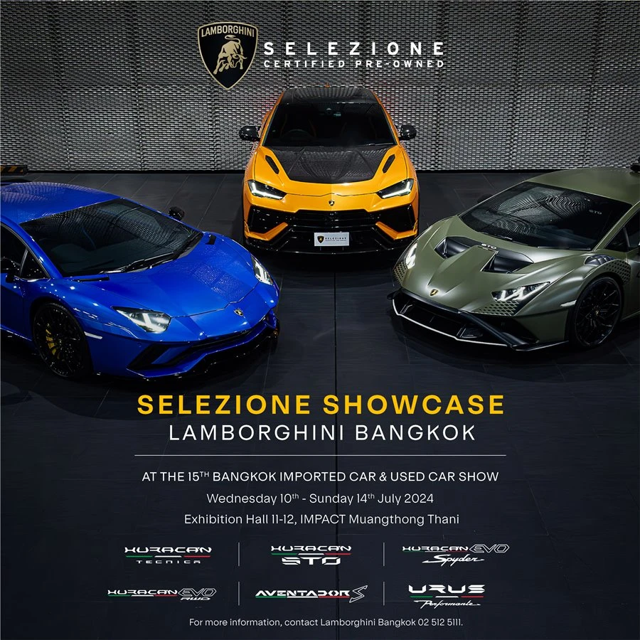 Bangkok Imported Car & Used Car Show ครั้งที่ 15 พร้อมเผยโฉมลัมโบร์กินี Pre-owned ที่ได้รับการรับรองคุณภาพจากทางลัมโบร์กินีและมาตรฐานสูงสุดจากเรนาสโซ มั่นใจด้วยการตรวจสอบประวัติรถได้ทุกคัน มาพร้อมข้อเสนอสุดพิเศษเฉพาะในงาน อาทิ Huracán Tecnica, Huracán STO, Huracán EVO RWD, Aventador S, Huracán EVO Spyder และ Urus Performante ระหว่างวันที่ 10-14 กรกฎาคม 2567 ณ อิมแพ็ค อารีนา เมืองทองธานี, Exhibition Hall 11-12