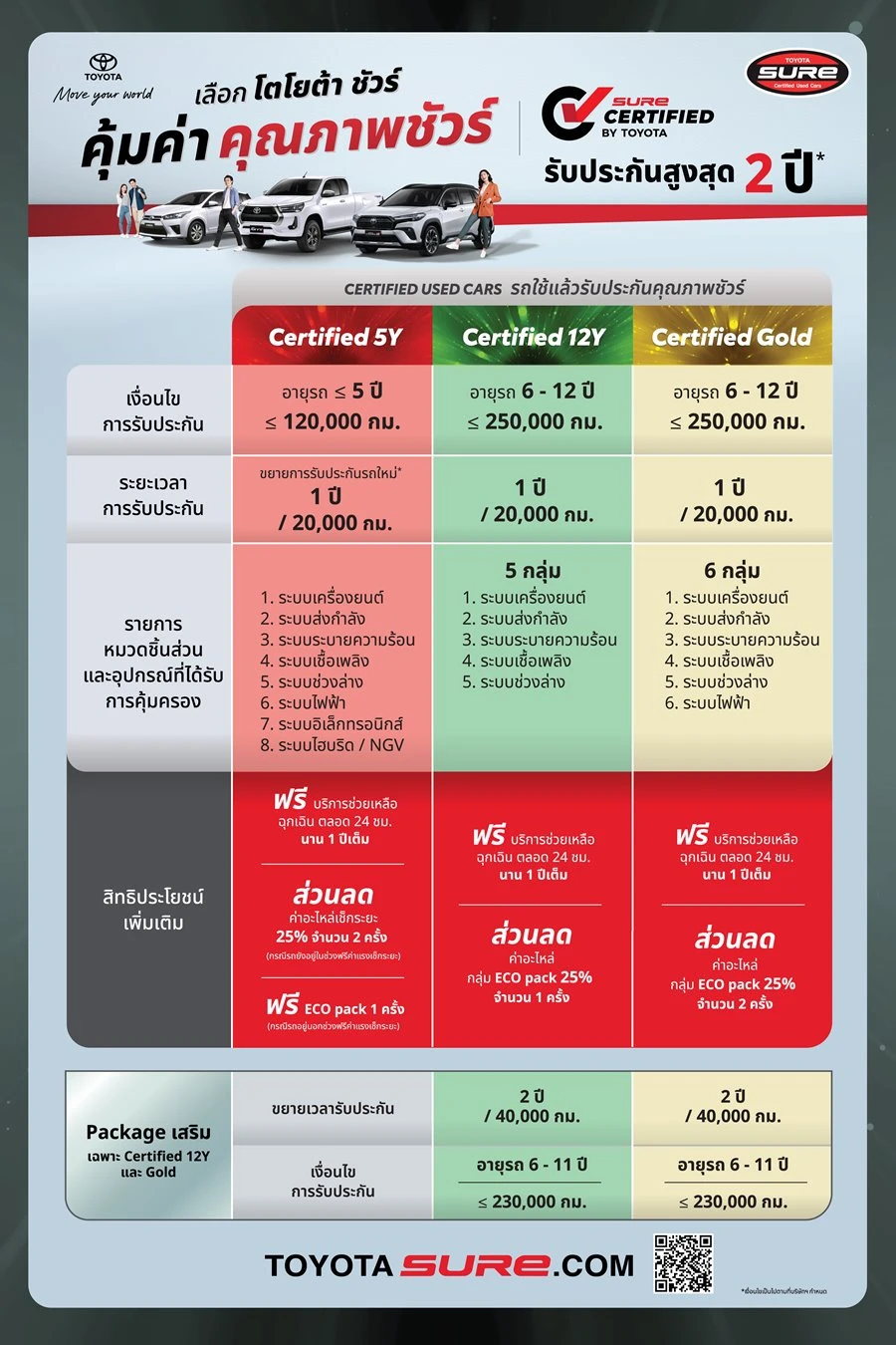 โดยตั้งแต่ 1 มิถุนายน 2567 ที่ผ่านมา Toyota Sure Certified รูปแบบใหม่ขยายการรับประกันที่รับรองคุณภาพรถอายุสูงสุด 12 ปี หรือไมล์ไม่เกิน 250,000 กม.* สูงสุด 2 ปี 40,000 กม. โดยรถทุกคันสามารถเข้ารับบริการ ได้ที่ศูนย์บริการโตโยต้ากว่า 450 แห่ง ทั่วประเทศเช่นเดียวกับรถใหม่โตโยต้า