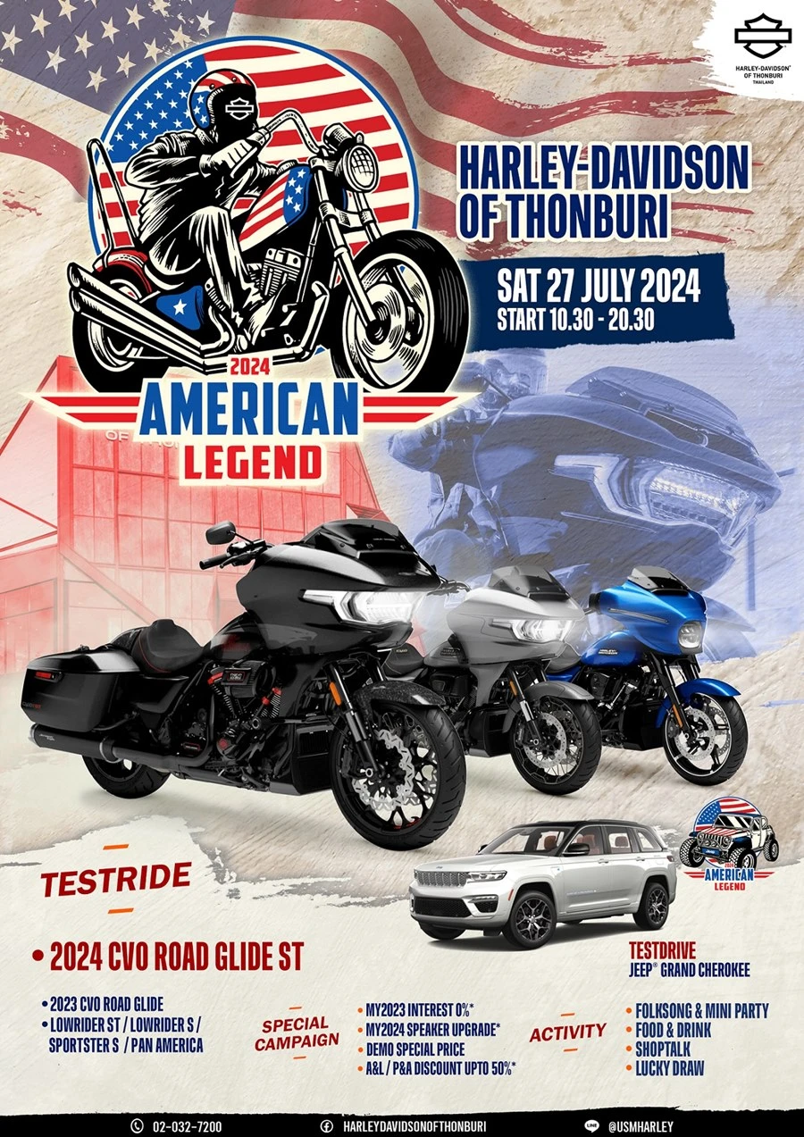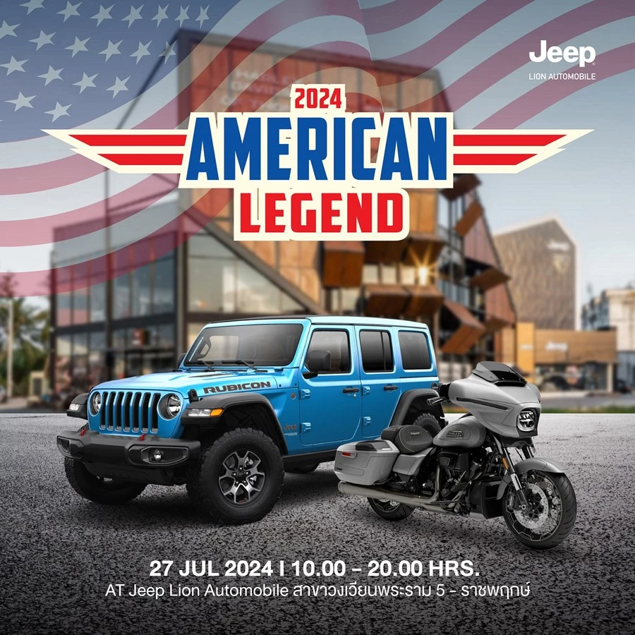 American Legend ในวันเสาร์ที่ 27 กรกฎาคมนี้ เวลา 10:00-20:00 น. ที่โชว์รูม จี๊ป ไลอ้อน ออโตโมบิล และโชว์รูม ฮาร์ลีย์-เดวิดสัน สาขาวงเวียนพระราม 5-ราชพฤกษ์