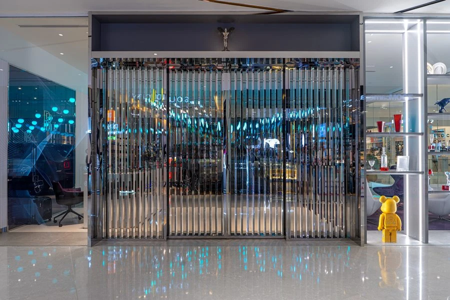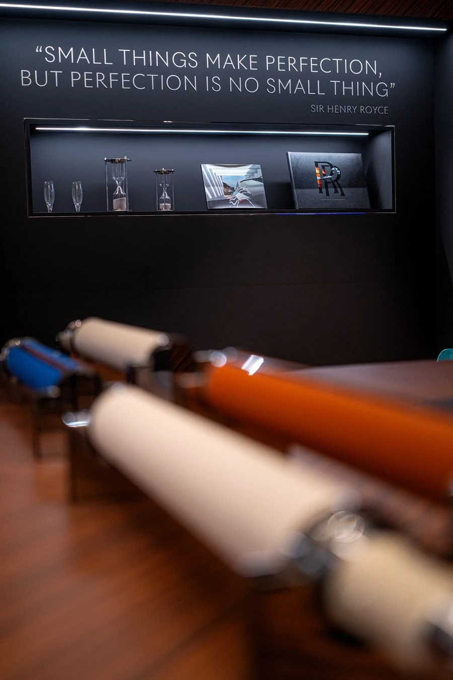 บูทีคที่เปี่ยมด้วยนวัตกรรมแห่งใหม่นี้ ได้รับการรังสรรค์ขึ้นอย่างประณีตและพิถิพิถัน เช่นเดียวกับโชว์รูม โรลส์-รอยซ์ ที่ใหญ่ที่สุดในโลก บริเวณทางเข้า ลูกค้าจะเดินผ่านประตูที่ออกแบบให้มีลักษณะคล้ายกับกระจังหน้าของ โรลส์-รอยซ์ ที่ได้แรงบันดาลใจจากเสาของวิหารแพนทิออน พร้อมกับสัญลักษณ์นางฟ้า (Spirit of Ecstasy) ที่อยู่ด้านบน และเมื่อก้าวสู่ด้านใน ก็จะพบกับยนตรกรรม โรลส์-รอยซ์ ที่จัดแสดงภายใต้ชุดไฟ kinetic lightning ที่สามารถปรับระดับให้ไล้ไปตามแนวหลังคาของ โรลส์-รอยซ์ แต่ละรุ่นได้อย่างงดงาม ขณะที่มุมพักผ่อนด้านหน้าจะมีพื้นที่จัดแสดงงานศิลป์สุดหรูหลากหลายแบรนด์ เรียกว่า Cabinet of Curiosities เพื่อสร้างแรงบันดาลใจ และเชิญชวนให้เกิดการสนทนาอย่างสร้างสรรค์