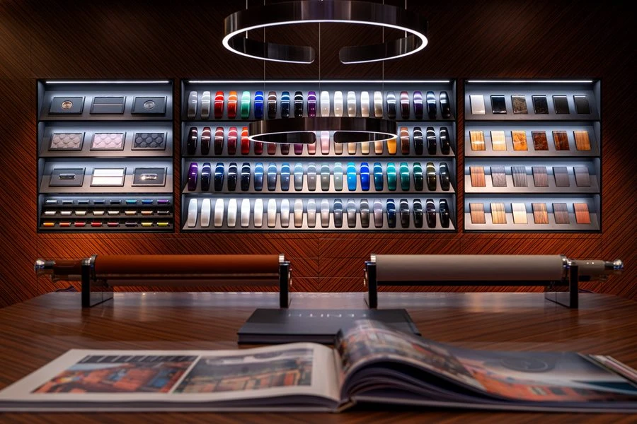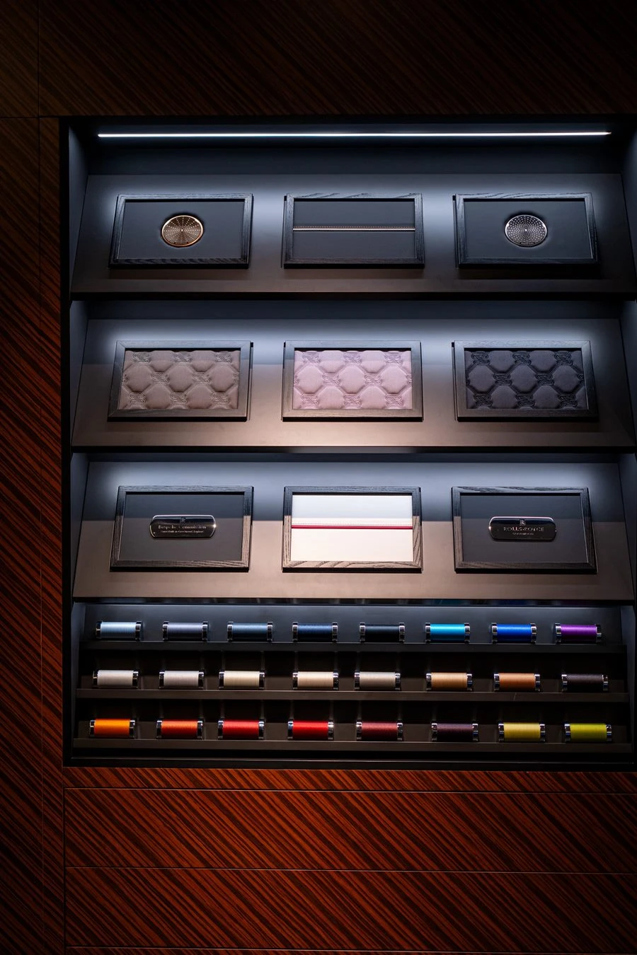 ไฮไลท์ของบูทีคแห่งนี้ คือ Atelier (อาทิลิเญ่) ซึ่งเป็นห้องพิเศษส่วนตัว ให้ลูกค้าสามารถรังสรรค์ยนตรกรรมคันโปรดแบบ Bespoke กลางห้องมีโต๊ะไม้ขนาดใหญ่ ไล่ระดับความลาดเอียง เปรียบเสมือนโต๊ะทำงานของศิลปินผู้เชี่ยวชาญ โดยมีจอแอลอีดีขนาดใหญ่อยู่ด้านหน้า เพื่อใช้ประกอบการและชมรายละเอียดต่างๆ หลังจากทำการ Bespoke ขณะที่แอลอีดีทรงกลมที่แขวนด้วยสลิงจากเพดาน สามารถปรับระดับเพื่อตรวจสอบรายละเอียดของเนื้อสีหรือวัสดุต่างๆ ได้อย่างใกล้ชิด อีกทั้งในห้องนี้ยังมีตัวอย่างหลังคาดาวตก Starlight Headliner ที่สามารถสัมผัสถึงความประณีตและพิถีพิถันกับผลงานระดับ craftsmanship ได้อย่างใกล้ชิด