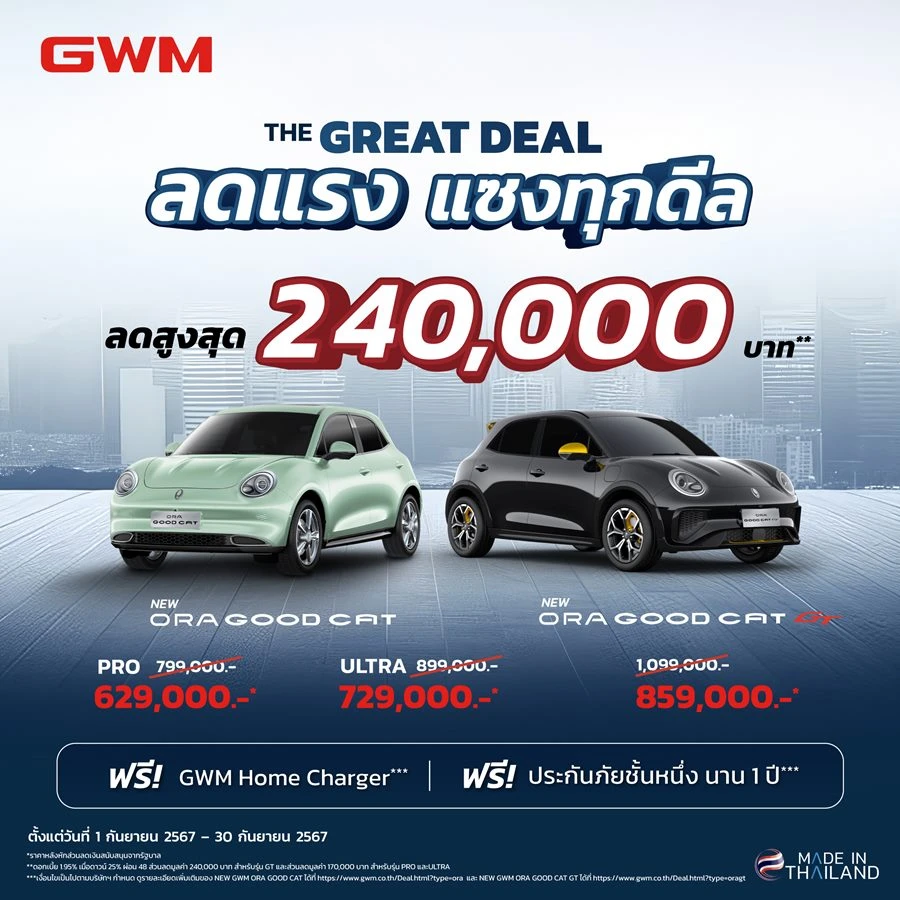 - GWM New ORA Good Cat รุ่น GT จากราคา 1,099,000 บาท เหลือเพียง 859,000 บาท (ส่วนลด 240,000 บาท)