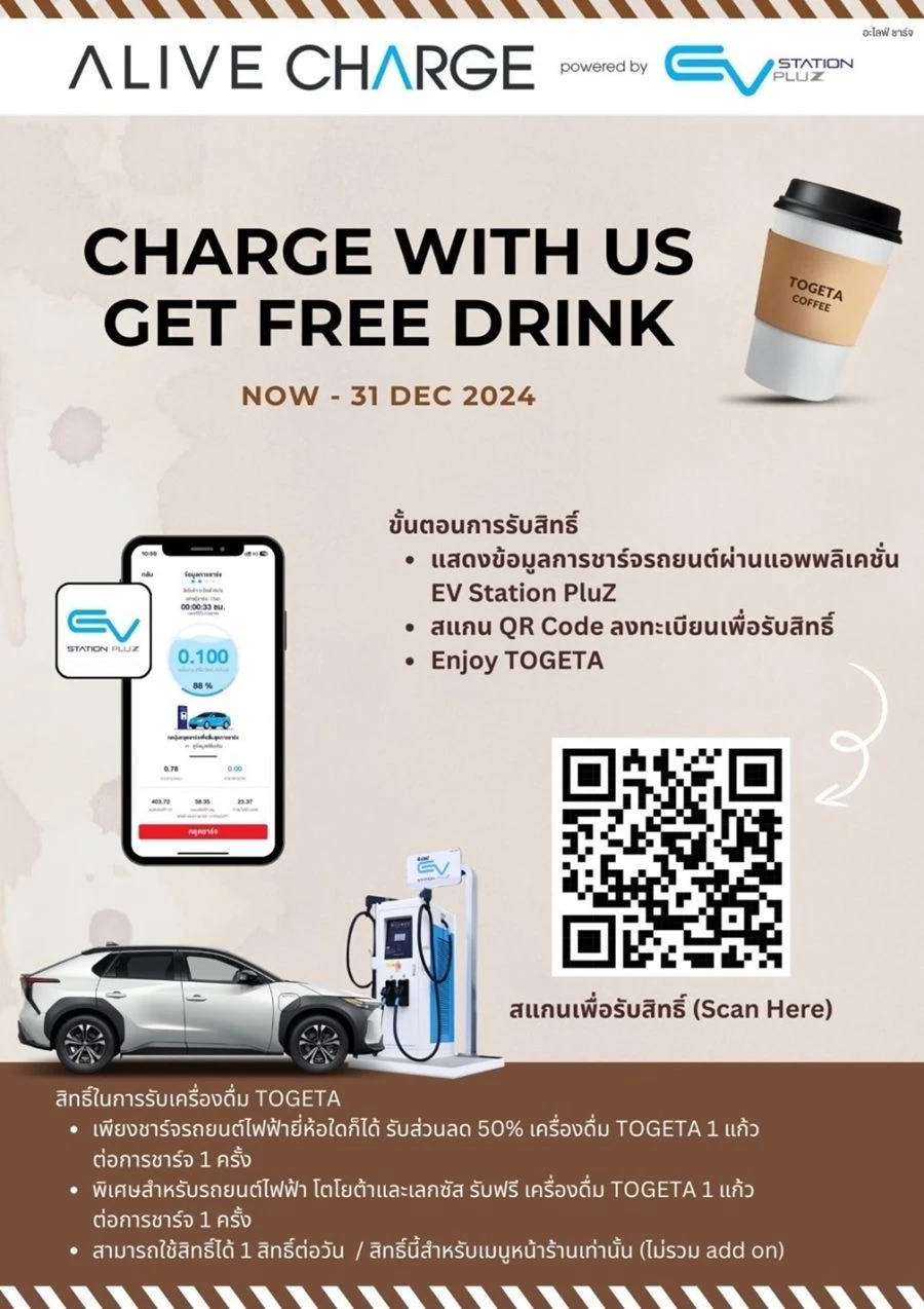 - ชาร์จรถยนต์ยี่ห้ออื่น รับส่วนลด 50% สำหรับกาแฟ Togeta ต่อการชาร์จหนึ่งครั้ง