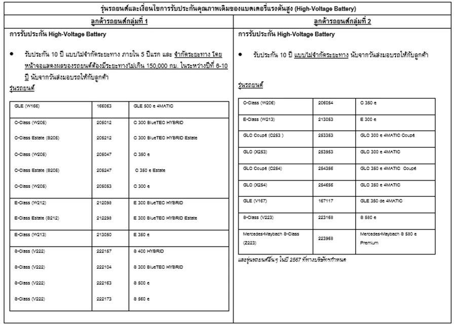 - High-Voltage Battery ได้รับการตรวจสอบคุณภาพปัจจุบันโดยศูนย์บริการเมอร์เซเดส-เบนซ์ อย่างเป็นทางการทั่วประเทศ และมีผลทดสอบคุณภาพผ่านเกณฑ์โดยแบตเตอรี่ยังคงใช้งานได้ (แบตเตอรี่เสื่อมสภาพตามการใช้งานปกติ) ตามเงื่อนไขและข้อกำหนดการรับสิทธิ*