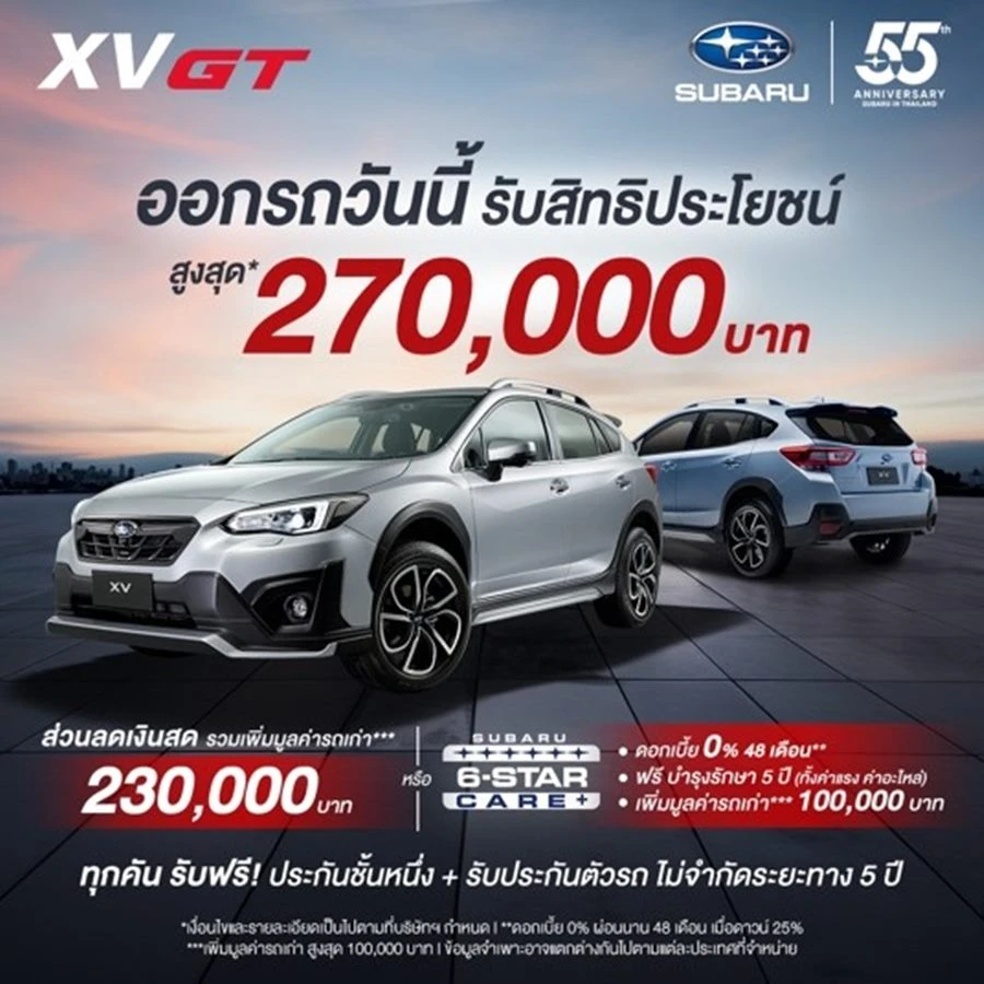 แต่เนื่องด้วยรถผลิตในประเทศเหลือไม่มากนัก แคมเปญโปรโมชั่นยังคงมีให้ในระดับที่ผู้จำหน่ายแข่งขันได้ในตลาด และยังคงให้แพคเก็จดูแลรถ 6-STAR CARE+ เป็นแพคเก็จมาตรฐานพร้อมกับตัวรถนาน 5 ปี ลูกค้าได้ความสบายใจในระยะยาว ครอบคลุมดูแลค่าบำรุงรักษาฟรีทั้งค่าแรง-ค่าอะไหล่ 5 ปีหรือ 100,000 กม., รับประกันตัวรถนาน 5 ปี ไม่จำกัดระยะทาง และบริการช่วยเหลือฉุกเฉิน 24 ชั่วโมง 5 ปี ในโอกาสฉลองครบรอบ 55 ปีของซูบารุในประเทศไทย