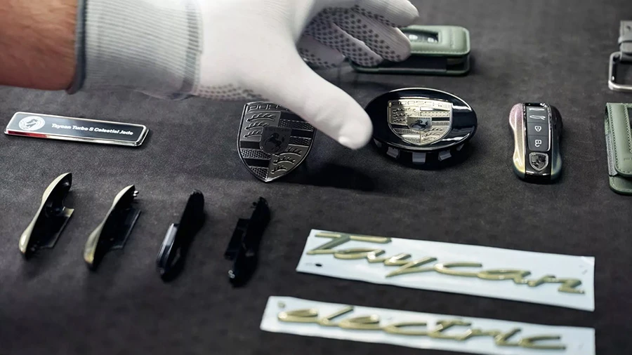 Taycan Turbo S Celestial Jade ยังมาพร้อมโลโก้สำหรับรถรุ่นนี้โดยเฉพาะ ซึ่งได้รับแรงบันดาลใจจากสัตว์ในตำนานของจีนอย่าง LongMa ซึ่งมีหัวเป็นมังกร (Long) และตัวเป็นม้า (Ma) โดยในโลโก้ใหม่จะมีทั้งหัวของมังกรและม้า ซึ่งเป็นสัญลักษณ์แสดงถึงปีมังกรและที่มาของชื่อ Taycan (ลูกม้าที่มีชีวิตชีวา ในภาษาตุรกี) โลโก้ดังกล่าวจะอยู่ที่โครงประตู, ธรณีประตูคาร์บอนแบบเรืองแสง และพนักพิงศีรษะที่เบาะนั่ง