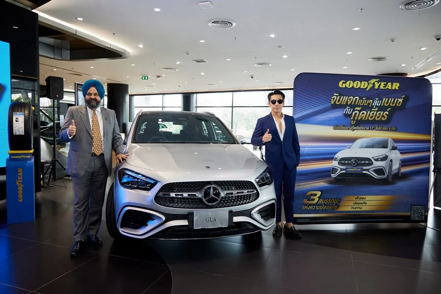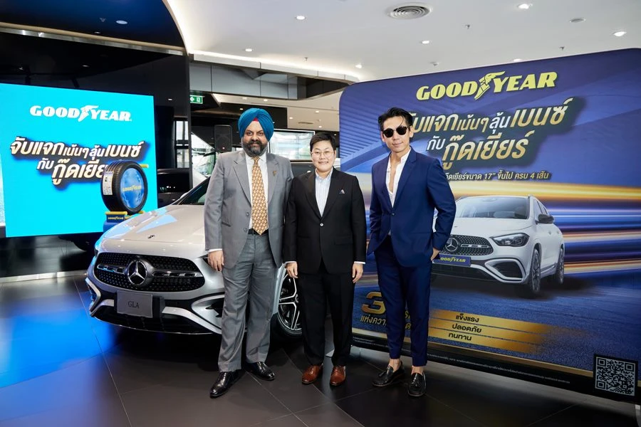 นายแรนดีพ ซิง กานวา (ซ้าย) กรรมการผู้จัดการ บริษัท กู๊ดเยียร์ (ประเทศไทย) จำกัด (มหาชน) เปิดตัวโปรโมชั่น จับแจกเน้น ๆ ลุ้นเบนซ์กับกู๊ดเยียร์ โปรโมชั่นแคมเปญสุดยิ่งใหญ่สำหรับลูกค้ากู๊ดเยียร์ได้ร่วมลุ้นยนตรกรรมระดับพรีเมียม โดยได้รับเกียรติจาก คุณตวงรัตน์ ลิขิตพฤกษ์ (กลาง) กรรมการผู้จัดการ เบนซ์ บีเคเค กรุ๊ป และคุณวิเชียร กุศลมโนมัย (ขวา) ดีเจและพิธีกรชื่อดัง ร่วมงาน ณ โชว์รูมเบนซ์ บีเคเค กรุ๊ป