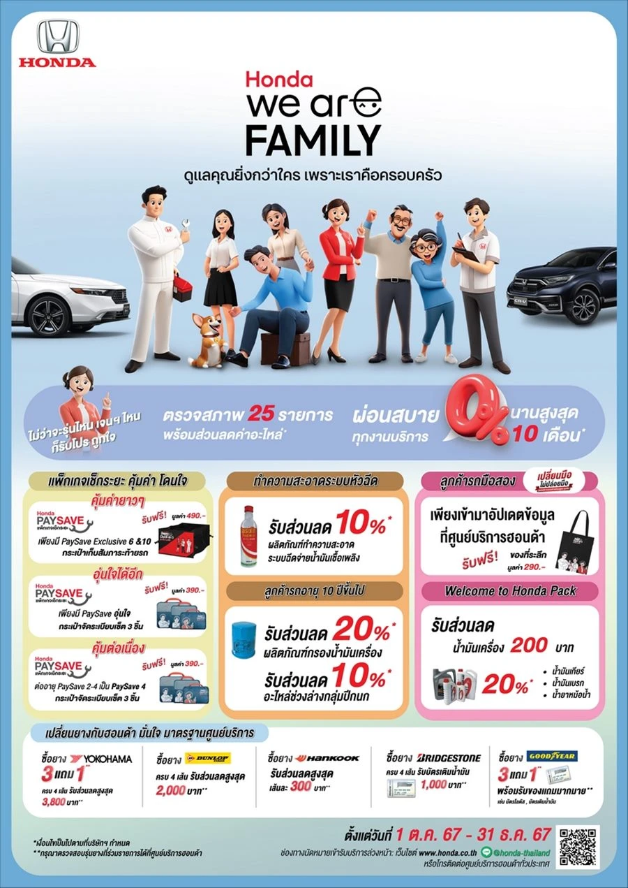 บริษัท ฮอนด้า ออโตโมบิล (ประเทศไทย) จำกัด ตอกย้ำการนำเสนอยนตรกรรมคุณภาพ พร้อมส่งมอบการบริการหลังการขายต่อเนื่องอย่างครบวงจรของเครือข่ายศูนย์บริการฮอนด้าทั่วประเทศที่ได้มาตรฐาน เปิดตัวแคมเปญพิเศษ “Honda, We are family เพราะเราคือครอบครัวฮอนด้า” เชิญชวนทั้งลูกค้ารถใหม่ ลูกค้ารถปัจจุบัน และลูกค้ารถมือสอง เข้ารับบริการที่ศูนย์บริการฮอนด้า 219 แห่งทั่วประเทศ ตั้งแต่วันที่ 1 ตุลาคม – 31 ธันวาคม 2567 เพื่อรับสิทธิประโยชน์พิเศษ* สำหรับครอบครัวฮอนด้า อาทิ บริการตรวจสภาพรถยนต์ฟรี 25 รายการ ฟรีของที่ระลึกจากฮอนด้า เมื่อลูกค้ามีแพ็กเกจ PaySave Exclusive 6, 10 หรือ PaySave อุ่นใจ หรือเพียงต่ออายุแพ็กเกจ PaySave เป็น PaySave 4 หรือ PaySave อุ่นใจ พร้อมส่วนลดอะไหล่พิเศษ และจัดเต็มกับโปรโมชันยางรถยนต์หลายยี่ห้อ ทั้งโยโกฮาม่า, กู๊ดเยียร์, บริดจสโตน, ดันลอป และฮันกุก สำหรับลูกค้ารถยนต์มือสองที่เข้ามารับบริการครั้งแรก รับของที่ระลึกและส่วนลดพิเศษ “Welcome to Honda Family” เพียงอัปเดตข้อมูลเจ้าของรถยนต์ใหม่และใช้บริการตามเงื่อนไข นอกจากนี้ ลูกค้ายังสามารถเลือกผ่อนสบาย 0% ทุกงานบริการ นานสูงสุด 8 เดือน* และยางรถยนต์นานสูงสุด 10 เดือน* อีกด้วย
