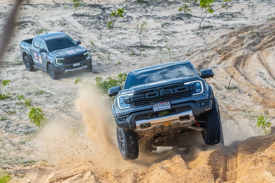 จากเมืองดาลัดคาราวานมุ่งสู่ทะเลทรายมุยเน่ หรือที่รู้จักกันในชื่อ ซาฮาร่าแห่งเวียดนาม หนึ่งในสถานที่ท่องเที่ยวที่โดดเด่นของประเทศเวียดนาม ด้วยเนินทรายสีทองอร่ามทอดยาวสุดลูกหูลูกตา สลับกับทะเลสาบน้ำจืดสีฟ้าใส สร้างทัศนียภาพอันน่าทึ่งราวกับภาพวาด ผู้ร่วมเดินทางได้ทดลองใช้การขับขี่ในโหมดทราย และโหมดบาฮาอันเป็นเอกลักษณ์ของฟอร์ด เรนเจอร์ แร็พเตอร์ ซึ่งรถจะปรับเข้าสู่การขับขี่โดยใช้เกียร์สูงขับเคลื่อน 4 ล้อ (4H) คันเร่งจะปรับให้มีการตอบสนองสูงสุดเพื่ออัตราเร่งที่ดีที่สุด ระบบท่อไอเสียและช่วงล่างจะถูกปรับให้เป็นโหมดบาฮาเช่นกัน เพื่อตอบสนองการขับขี่ออฟโรดแบบความเร็วสูง พร้อมรับมือกับการขับขี่บนทะเลทรายโดยเฉพาะ ฟอร์ด เรนเจอร์ แร็พเตอร์ ยังมีระบบความปลอดภัยขั้นสูง เช่น ระบบควบคุมเสถียรภาพการทรงตัว ระบบป้องกันล้อหมุนฟรี และระบบลดความเสี่ยงจากการพลิกคว่ำ ทำงานร่วมกันเพื่อเพิ่มความมั่นใจให้กับผู้ขับ เทคโนโลยีเหล่านี้ของรถ ไม่เพียงช่วยให้ผู้ขับขี่พิชิตความท้าทายของทะเลทรายมุยเน่ได้อย่างง่ายดายแล้ว ยังมอบประสบการณ์การขับขี่ที่สนุกและปลอดภัยขั้นสุดอีกด้วย