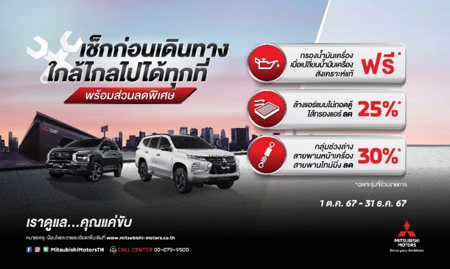 ในช่วงปลายฤดูฝน ความชื้นของสภาพอากาศอาจทำให้เกิดความอับชื้นในห้องโดยสาร และ ปัญหาเรื่องฝุ่นละออง PM2.5 ที่เกิดในช่วงเวลานี้ส่งผลกระทบต่อคุณภาพอากาศ ดังนั้นการล้างแอร์รถยนต์จึงเป็นสิ่งที่จำเป็นที่ไม่ควรละเลย มิตซูบิชิ มอเตอร์ส พร้อมมอบส่วนลดร้อยละ 25 สำหรับไส้กรองระบบปรับอากาศ เมื่อเข้ารับบริการล้างแอร์แบบ ไม่ถอดตู้ และพิเศษยิ่งขึ้น สำหรับลูกค้ารถยนต์ ‘มิตซูบิชิ ปาเจโร สปอร์ต’ และ ‘มิตซูบิชิ ไทรทัน’ (ยกเว้น รถรุ่น มิตซูบิชิ ไทรทัน ใหม่ และมิตซูบิชิ ปาเจโร สปอร์ต รุ่นปี 2024) ฟรี! ไส้กรองน้ำมันเครื่องเมื่อรับบริการเปลี่ยนถ่ายน้ำมันเครื่องสังเคราะห์เบนซินดีเซล นอกจากนี้ การตรวจเช็คความพร้อมและสมรรถนะของรถยนต์อย่างสม่ำเสมอ จะเพิ่มความ อุ่นใจให้กับผู้ใช้รถขณะเดินทางท่องเที่ยวให้เพลิดเพลินกับช่วงเวลาที่แสนพิเศษกับครอบครัวได้อย่างเต็มที่ มิตซูบิชิ จึงมอบส่วนลดร้อยละ 30 สำหรับกลุ่มอะไหล่ช่วงล่าง สายพานหน้าเครื่อง และสายพานไทม์มิ่งที่ร่วมรายการ สำหรับรถยนต์มิตซูบิชิที่สิ้นสุดระยะเวลาการรับประกัน โดยลูกค้าสามารถเข้ารับบริการได้ที่ศูนย์บริการทั่วประเทศที่พร้อมให้บริการด้วยมาตรฐานสูงสุด โดยช่างผู้ชำนาญงานที่ได้รับการฝึกอบรม และอะไหล่แท้จากมิตซูบิชิ มอเตอร์ส ภายใต้สโลแกน ‘เราดูแล...คุณแค่ขับ’ ตั้งแต่วันนี้ จนถึงวันที่ 31 ธันวาคม 2567
