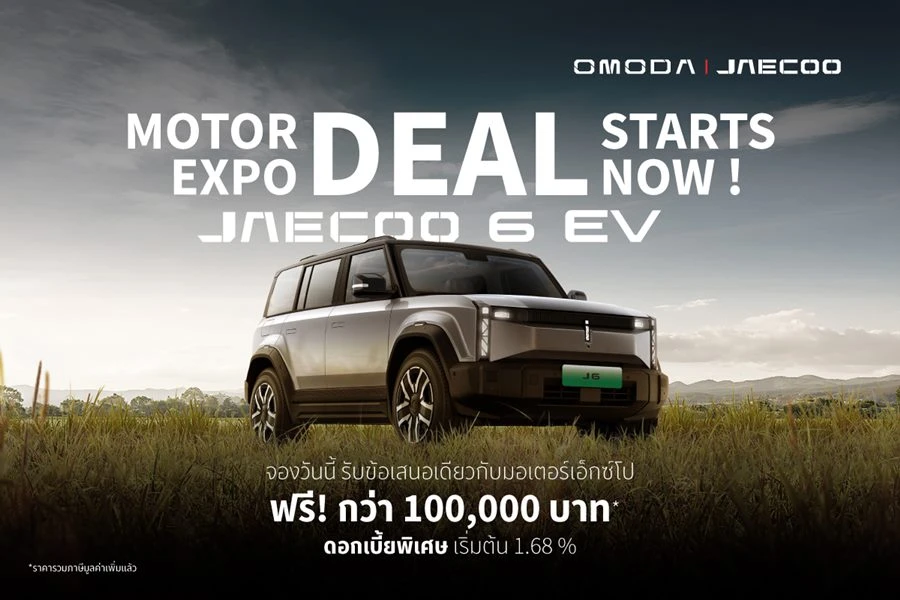 สำหรับผู้ที่สนใจสามารถจอง JAECOO 6 EV วันนี้ มาพร้อมกับเอกสิทธิ์ข้อเสนอพิเศษ แคมเปญ Motor Expo Deal: JAECOO 6 EV พร้อมทุกสภาพถนนก่อนใคร สำหรับผู้ที่จอง JAECOOO 6 EV รับข้อเสนอเดียวกับ Motor Expo มูลค่ากว่า 100,000 บาท** กับข้อเสนอพิเศษ ประกอบด้วย