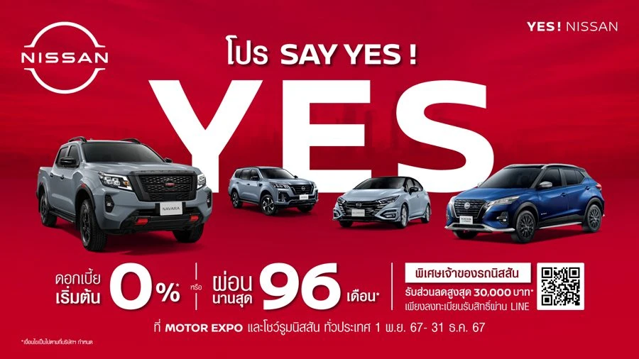 นิสสัน ยังได้เตรียมโปรโมชั่นพิเศษที่จะทำให้ลูกค้าเป็นเจ้าของรถยนต์คุณภาพเยี่ยมได้ง่ายขึ้นกับแคมเปญ SAY YES! ที่มีความหลากหลายให้ลูกค้าเลือกได้อย่างเหมาะสมกับความต้องการของตนเอง ตั้งแต่ดอกเบี้ยต่ำ 0% ไปจนถึงผ่อนนาน 96 เดือน