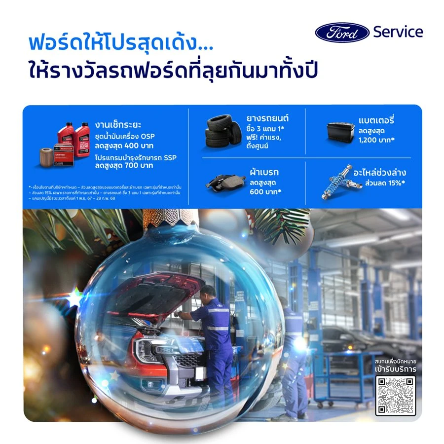 ฟอร์ด ประเทศไทย จัดแคมเปญสุดพิเศษส่งท้ายปี มอบข้อเสนอด้านบริการที่คุ้มค่าเพื่อเสริมความมั่นใจให้ลูกค้าตลอดการเดินทางช่วงเทศกาลพิเศษปลายปี ตั้งแต่ 1 พฤศจิกายน 2567 ถึง 28 กุมภาพันธ์ 2568 ตอกย้ำการดูแลลูกค้าเสมือนคนในครอบครัวกับหลากหลายสิทธิประโยชน์ที่ช่วยเตรียมรถยนต์ให้พร้อมเดินทางอย่างปลอดภัยและอุ่นใจ เมื่อนำรถเข้ารับบริการที่ศูนย์บริการฟอร์ดทั่วประเทศ