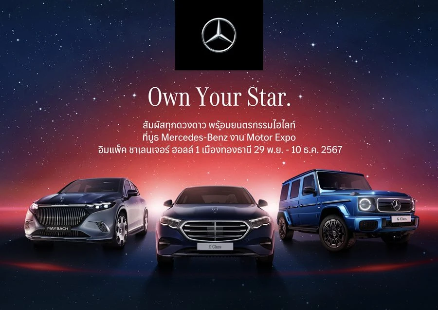 เบื้องหลังแนวคิดแคมเปญ Own Your Star มาจากสัญลักษณ์ดาวสามแฉกของ เมอร์เซเดส-เบนซ์ ซึ่งเปรียบยนตรกรรมแต่ละรุ่นเสมือนดวงดาวแต่ละดวงที่รอให้คุณมาครอบครอง โดยมีดาวดวงใหม่ที่กำลังจะเฉิดฉายในงาน Motor Expo ที่จะถึงนี้ อย่างยนตรกรรมที่เปิดตัวล่าสุด ได้แก่ G-Class ทั้งรุ่นเครื่องยนต์ดีเซลและรุ่นพลังงานไฟฟ้า EQ Technology, Mercedes-Maybach EQS SUV, E-Class รุ่น Exclusive Line และ V-Class รวมถึงดวงดาวอีกหลายเซกเมนต์ที่เตรียมให้คุณไปสัมผัสและเป็นเจ้าของในงาน