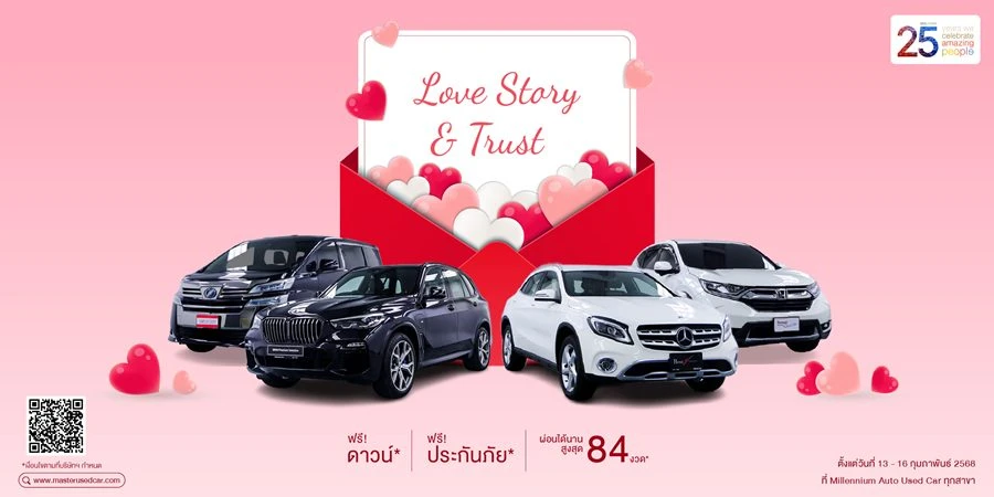 มาสเตอร์ เซอร์ทิฟายด์ ยูสคาร์ ศูนย์รวมรถยนต์มือสองครบวงจร ภายใต้ บริษัท มิลเลนเนียม กรุ๊ป คอร์ปอเรชั่น (เอเชีย) จำกัด (มหาชน) ต้อนรับวันวาเลนไทน์ ด้วยแคมเปญ Love Story & Trust ยกทัพยนตรกรรมระดับพรีเมียม ไมล์น้อย ราคาดี การันตีคุณภาพ มาให้เลือกสรรแบบจุใจ ให้ลูกค้าได้รับความคุ้มค่าตลอดเดือนกุมภาพันธ์นี้ ที่โชว์รูม มาสเตอร์ เซอร์ทิฟายด์ ยูสคาร์, บีเอ็มดับเบิลยู เซอร์ทิฟายด์ ยูสคาร์ บาย มิลเลนเนียม ออโต้ และ ซัมมิท ฮอนด้า ยูสคาร์ ทุกสาขา