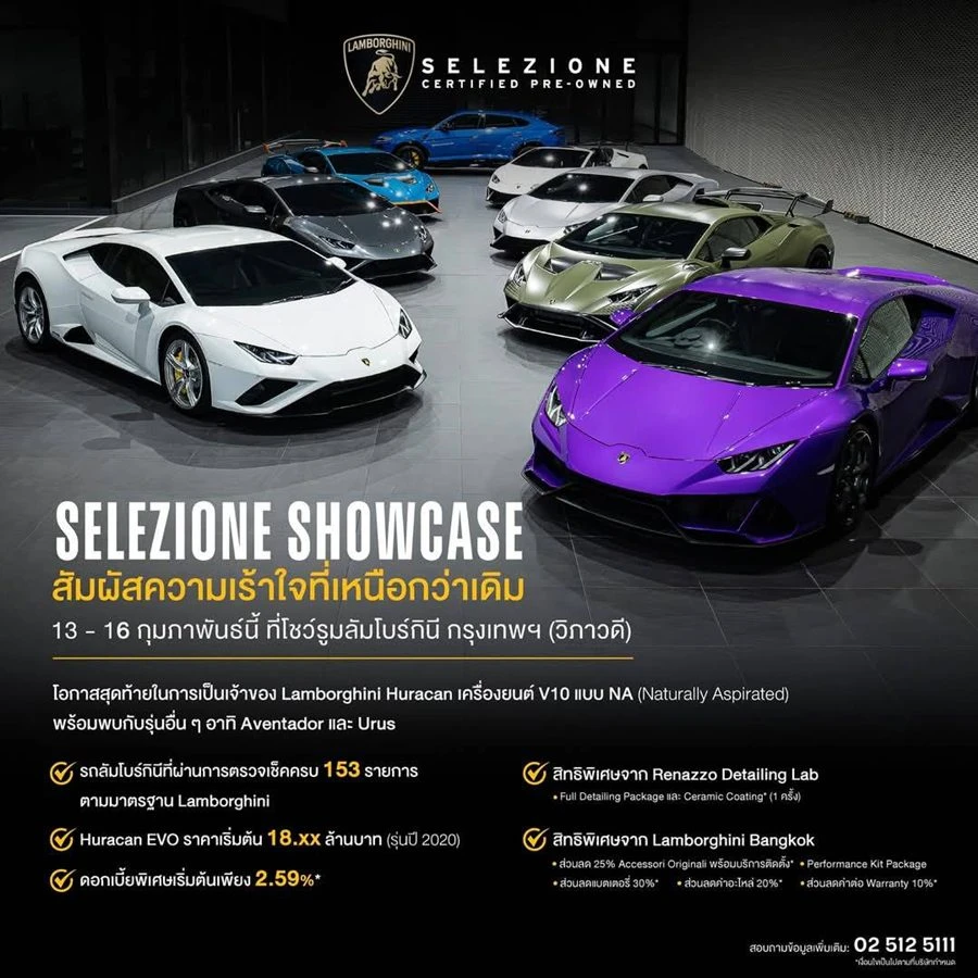 Lamborghini Selezione Certified Pre-owned กว่า 30 คัน เผยโฉมลัมโบร์กินี Pre-owned ที่ผ่านการตรวจเช็คประวัติรถและ 153 รายการ ตามมาตรฐานโรงงาน Lamborghini และพร้อมส่งมอบทันที ซึ่งเป็นโอกาสทองที่ผู้ซื้อและผู้ขายจะได้พบกันโดยตรง มาพร้อมกับข้อเสนอสุดพิเศษเฉพาะในงาน ที่เรียกได้ว่าเป็นดีลที่คุ้มที่สุดและดีที่สุดแห่งปี