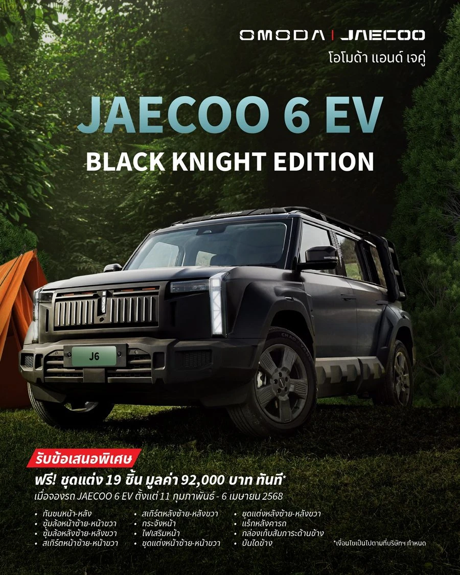 ข้อเสนอพิเศษที่ 2 JAECOO 6 EV “BLACK KNIGHT EDITION” สำหรับผู้ที่ชื่นชอบการแต่งแบบจัดเต็มที่ไม่เหมือนใคร ฟรีชุดแต่ง 19 ชิ้น มูลค่า 92,000 บาท* ทันที เมื่อจองรถ JAECOO 6 EV ตั้งแต่ 11 กุมภาพันธ์ – 6 เมษายน 2568